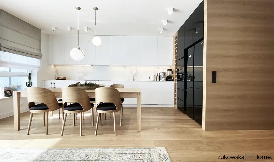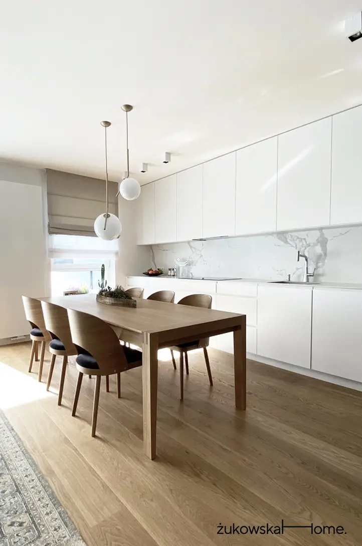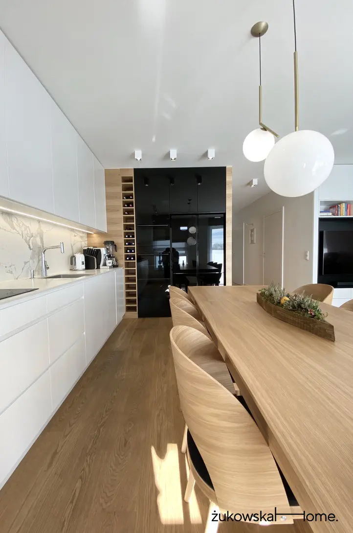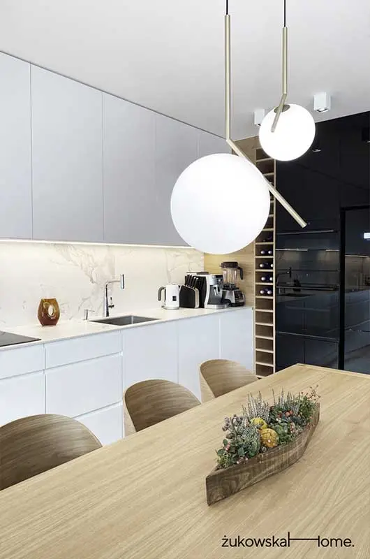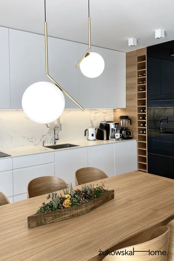 Oświetlenie nad stołem to już ikona designu IC LIGHTS SUSPENSION 2 od producenta Flos. Natomiast oświetlenie punktowe to producent Sternlight Surface. Światło w znakomity sposób podkreśla szlachetną biel oraz drewno we wnętrzu.