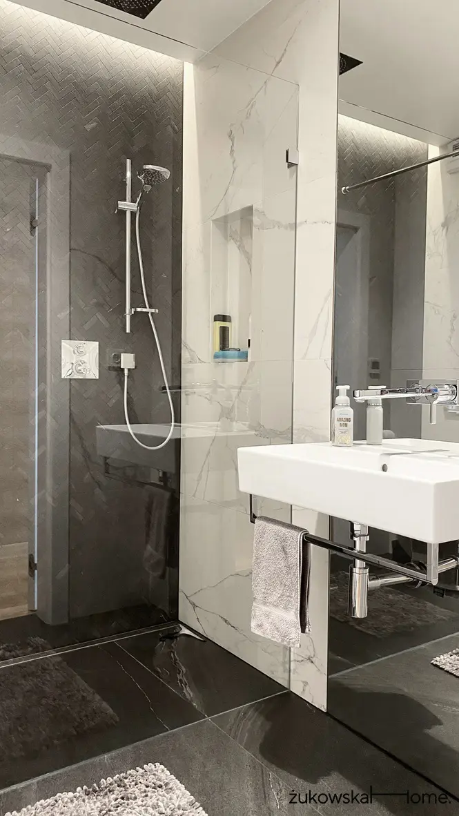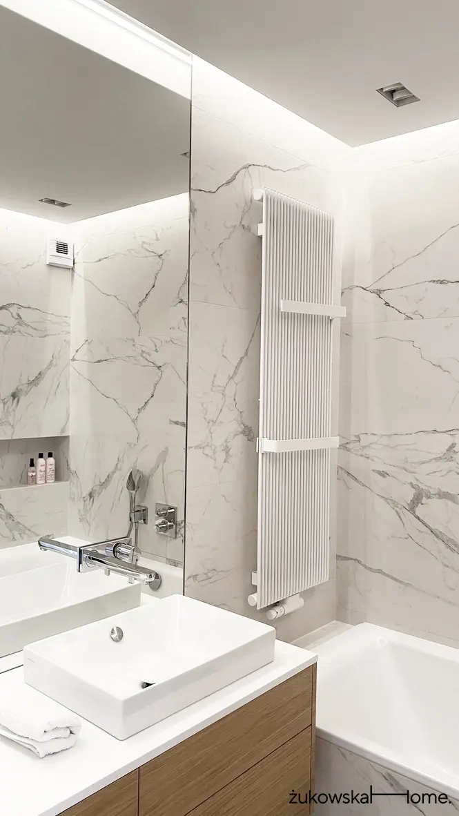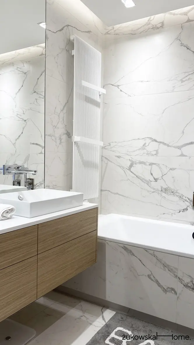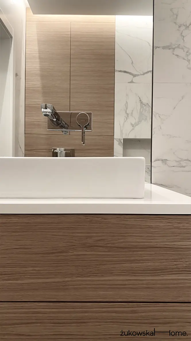 Łazienka jest konsekwentnie urządzona do reszty mieszkania. Biel jest uniwersalnym kolorem, który dobrze sprawdza się w szczególnie niewielkiej łazience. Optycznie powiększa przestrzeń, nadaje się do pomieszczeń o każdym metrażu. Biały kolor dobrze komponuje się z każdym kolorem, tworząc harmonijne kompozycje. W łazienkach biel kojarzy się z lekkością i czystością. Większość wyposażenia: umywalki, miski wc, wanny czy brodziki wybieramy właśnie w tym kolorze, więc białe ściany, czy podłogi będą idealnym uzupełnieniem projektów. Drewno w aranżacji wnętrz dodaje przytulnego charakteru, ociepla przestrzeń. Połączenie bieli i drewna stanowi neutralne tło dla pozostałego wyposażenia w łazience, tworząc spójną aranżację.