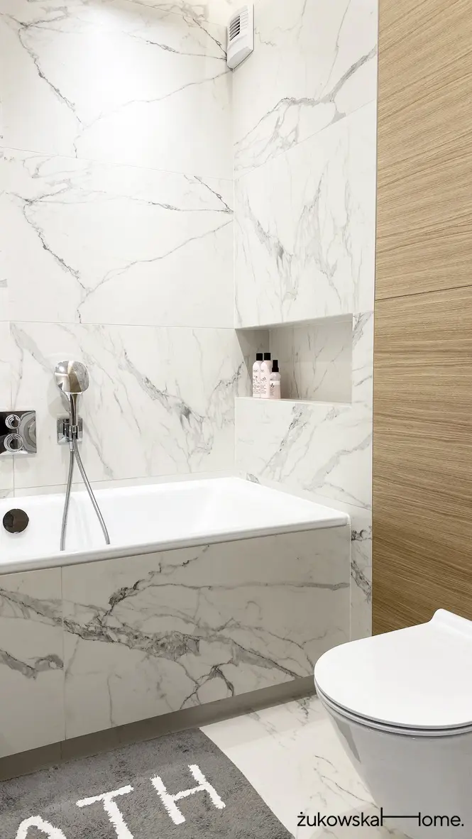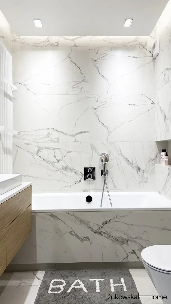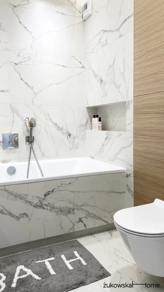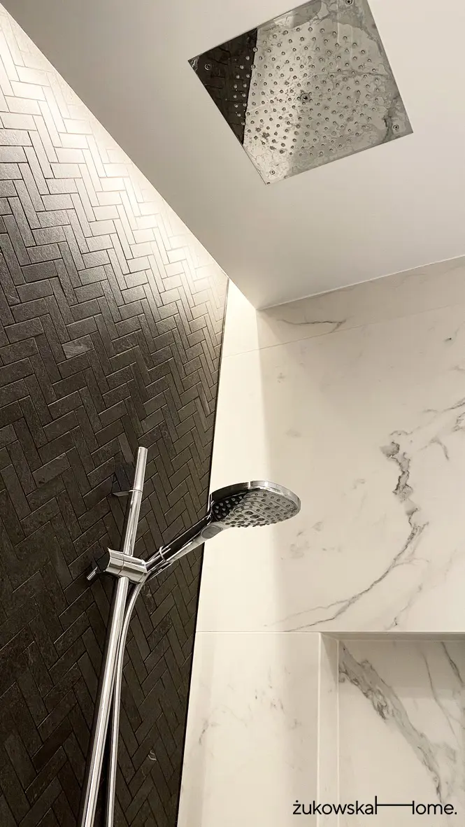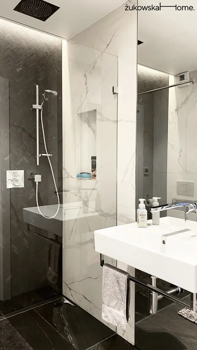 Łazienka jest konsekwentnie urządzona do reszty mieszkania. Biel jest uniwersalnym kolorem, który dobrze sprawdza się w szczególnie niewielkiej łazience. Optycznie powiększa przestrzeń, nadaje się do pomieszczeń o każdym metrażu. Biały kolor dobrze komponuje się z każdym kolorem, tworząc harmonijne kompozycje. W łazienkach biel kojarzy się z lekkością i czystością. Większość wyposażenia: umywalki, miski wc, wanny czy brodziki wybieramy właśnie w tym kolorze, więc białe ściany, czy podłogi będą idealnym uzupełnieniem projektów. Drewno w aranżacji wnętrz dodaje przytulnego charakteru, ociepla przestrzeń. Połączenie bieli i drewna stanowi neutralne tło dla pozostałego wyposażenia w łazience, tworząc spójną aranżację.