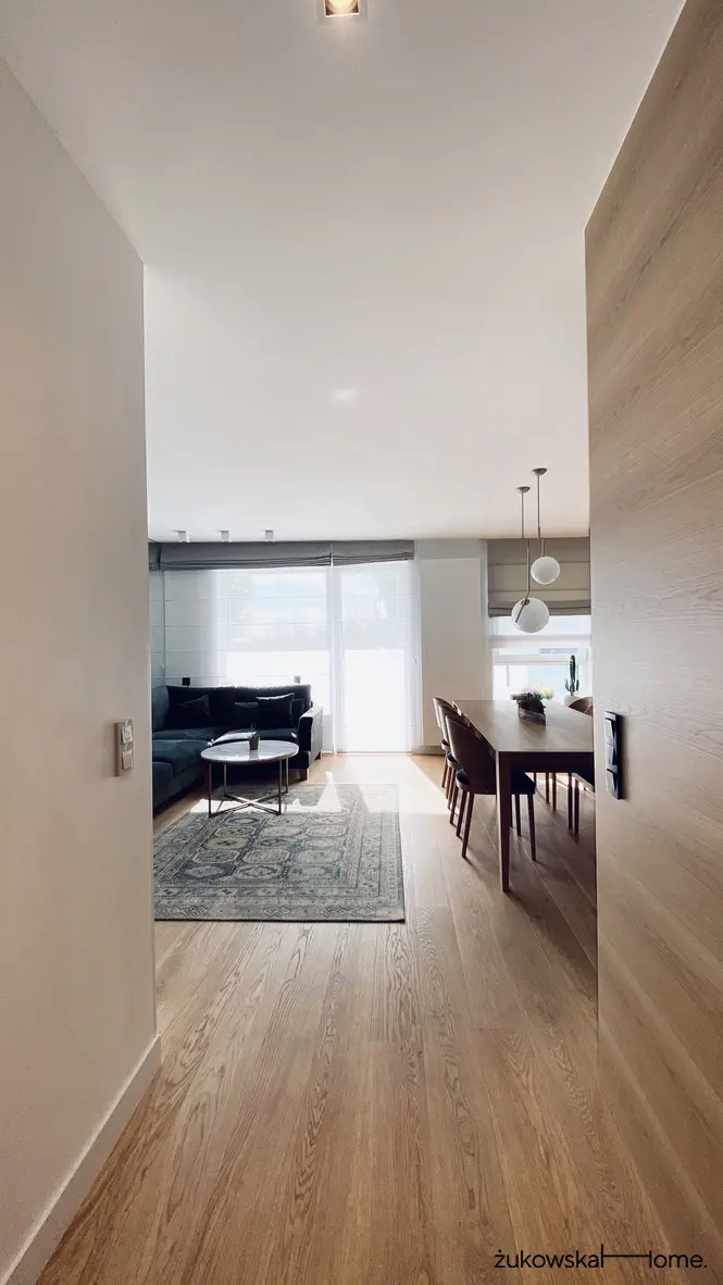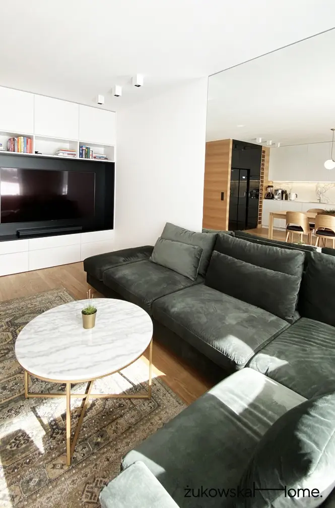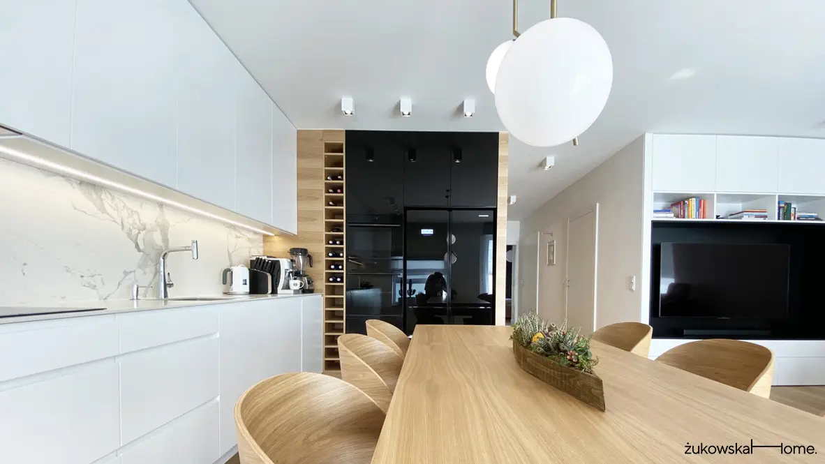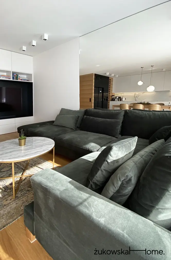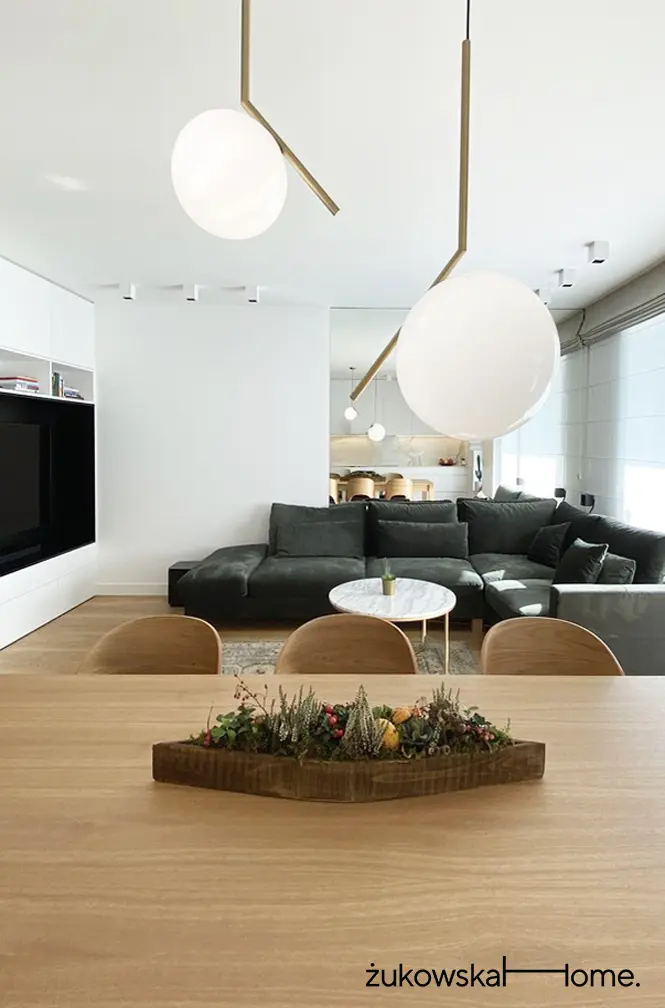 Wnętrza mieszkania zaprojektowane przez architektkę z pracowni Żukowska Home to klasyka nowoczesnego stylu. Biel, drewno i delikatne nuty zieleni. Kompozycje kolorystyczne konsekwentnie utrzymano we wszystkich pomieszczeniach projektowanego mieszkania. Zieleń zestawiono z ocieplającymi przestrzeń bielą oraz naturalnym drewnem. Wnętrza stanowią zgraną całość o współczesnym wyrazie, a charakter mieszkania podkreślają dodatkowo elementy wyposażenia o ciekawej formie.