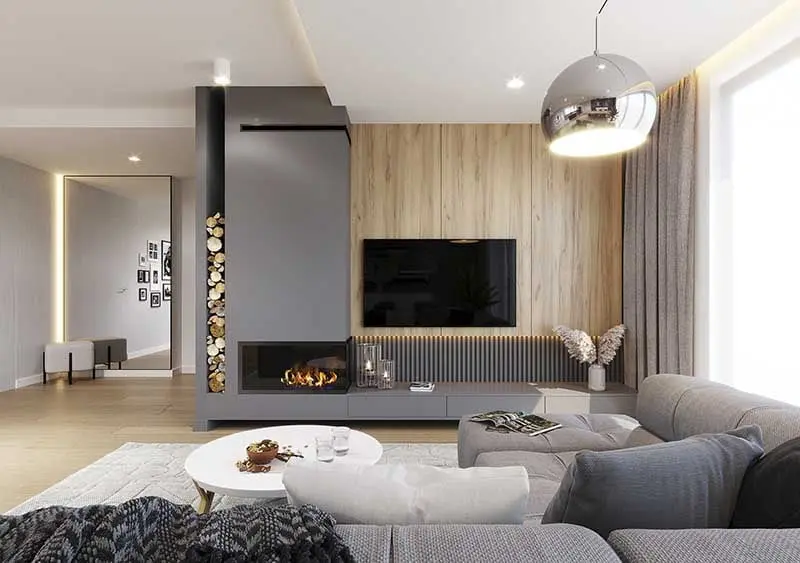 Salon prezentuje się nowocześnie. Dzięki pięknej tapecie firmy arte, która stanowi bazę kolorystyczną dla całego wnętrza udało się nadać salonowi niesamowity ton. Tapeta znajduje się zarówno na ścianach, jak i na drzwiach ukrytych, tworząc efekt niesamowitej spójności komfortowego salonu. W centrum strefy wypoczynkowej znajduje się stylowy, szary narożnik. Znalazło się tu również mnóstwo drewnianych elementów, przede wszystkim zaś na ścianach oraz na podłodze. Na podłodze także znalazł się efektownie wyglądający szary dywan. Cały salon prezentuje się komfortowo i przytulnie, a wrażenie to potęguje kominek. Małżonkowie będą mogli podziwiać ogień z kominka wygodnie zasiadając na kanapie i pijąc kawę przy stoliku kawowym. Przyjemny nastrój dodatkowo tworzą czarno-białe fotografie na przeciwległej ścianie.