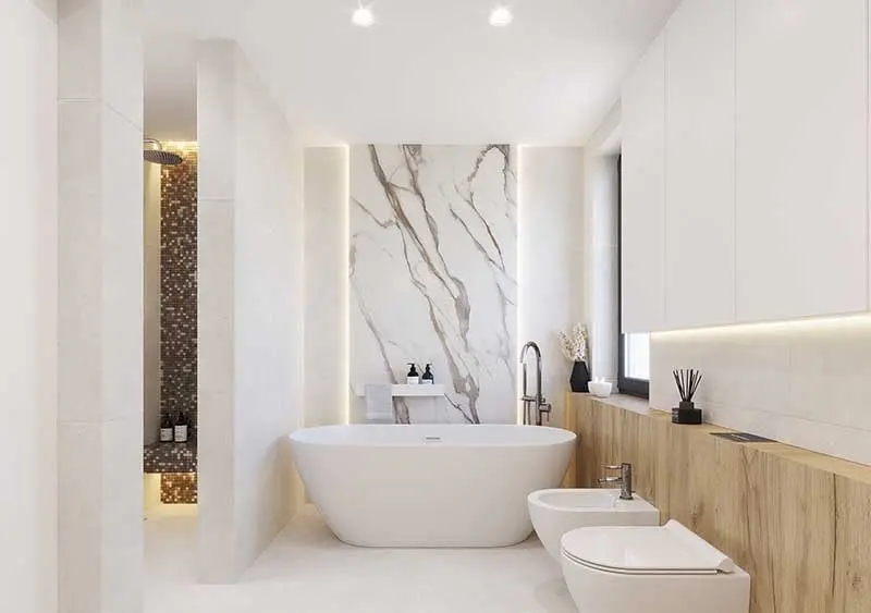 Jasna kolorystyka stała się głównym motywem w łazience. Podobnie jak w pozostałych pomieszczeniach, także i tu architekci postawili na drewniane elementy. Takie połączenia tworzą nieprzeciętny wygląd, dodatkowo wzmocniony dzięki marmurkowym płytkom. Całość dopełnia wanna wolnostojąca z baterią podłogową, a także biały bidet i toaleta. Łazienka podzielona została na dwie części za pomocą ścianki działowej. Odgradza ona wannę od prysznica, przez co domownicy mogą wybierać, czy wolą skorzystać z szybkiego i energetyzującego natrysku, czy może z ciepłej i kojącej kąpieli.