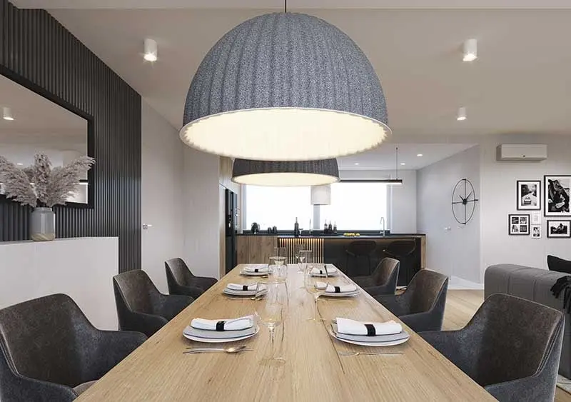 Strefę dzienną domu tworzy także jadalnia, połączona z salonem oraz kuchnią. Jej centrum to efektownie wyglądający stół z tapicerowanymi krzesłami. Są one bardzo efektowne z wyglądu oraz niezwykle wygodne. Nad stołem architekci kaim.work postanowili umieścić oryginalnie prezentującą się lampę Muuto, która dodaje pazura tej części domu. Ścianę jadalni wykończono lamelami w ciemnym kolorze, które bardzo elegancko kontrastują z białą szafką oraz z prostokątnym lustrem.