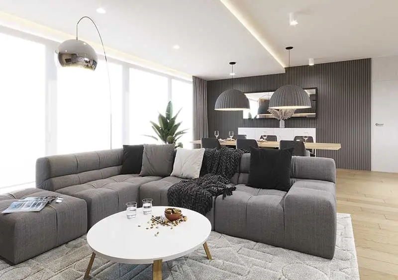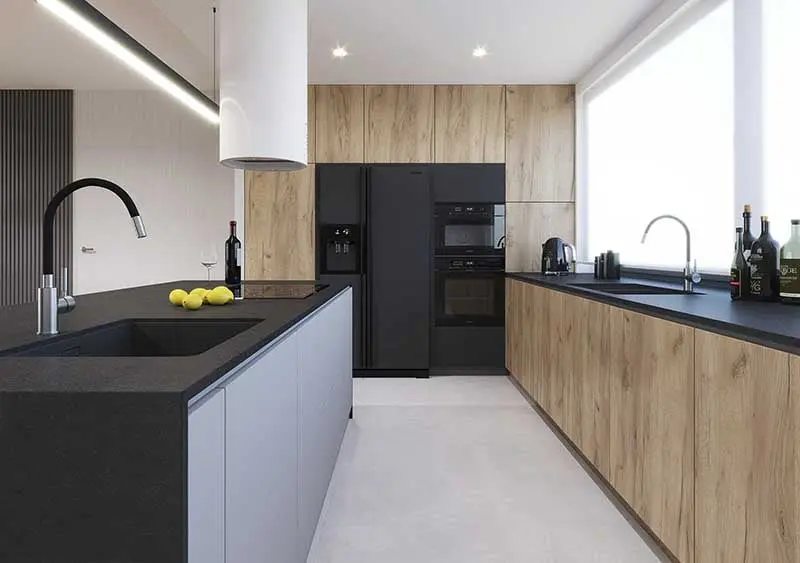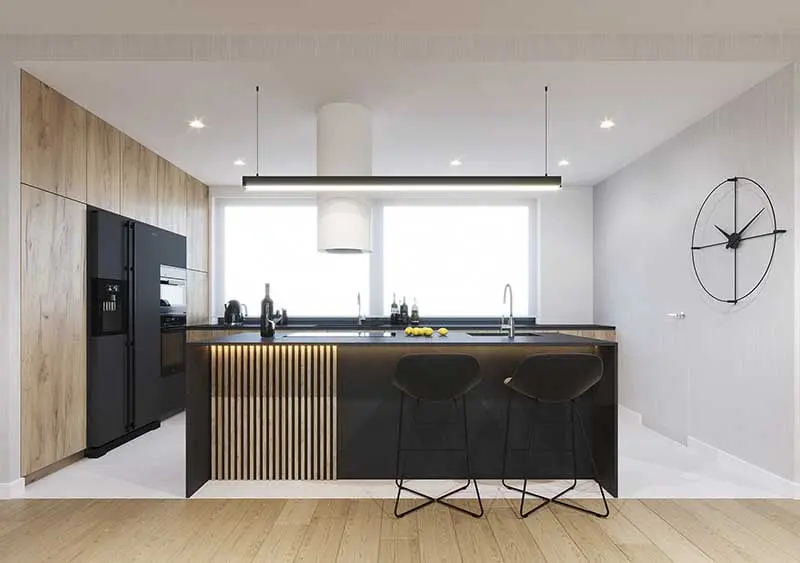 Ten dom oferuje bardzo nowoczesną aranżację swoim mieszkańcom. Jest ona odpowiedzią na potrzeby młodych oraz energicznych małżonków, którzy żyją w szybkim tempie i którzy potrzebują dużej przestrzeni do życia. Połączenie kuchni, jadalni oraz salonu stało się poniekąd naturalnym wyborem, który determinowany był stylem życia i bycia mieszkańców. Pomimo takiego zabiegu, architektom udało się stworzyć odizolowaną przestrzeń kuchenną, która jednocześnie znajduje się w pełnym połączeniu z resztą strefy dziennej. W jaki sposób osiągnięto ten zabieg? Wydzielając kuchnię przy pomocy wyspy kuchennej. Jest to kuchnia widna, w której architekci postawili na kontrastowe kolory, a także na dużą ilość lameli i drewna. Drewniane ściany wraz z ciemną zabudową wokół sprzętu AGD tworzą efektowny widok, który dopełnia antracytowy spiek kwarcowy znajdujący się na blacie kuchennym.