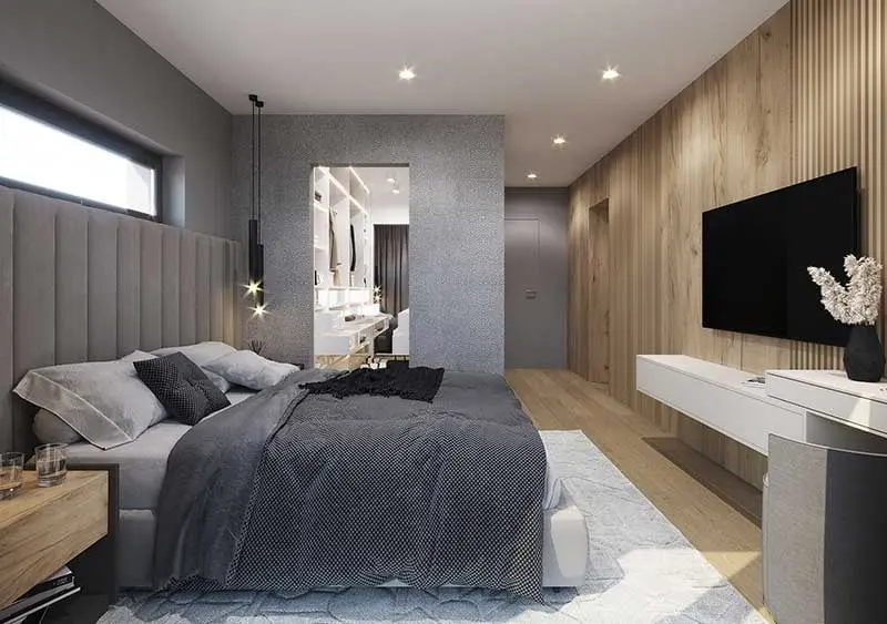 Dom małżonków posiada bardzo komfortowo urządzoną sypialnię, z dużym, wygodnym łóżkiem z szarym wezgłowiem. Do sypialni przylega garderoba z oryginalnie wyeksponowanymi drzwiami. W jej wnętrzu znalazło się miejsce na mnóstwo półek i szuflad, dzięki czemu mieszkańcy domu będą mieli gdzie schować swoje ubrania. Drewniane ściany sypialni plus modna tekstylna tapeta w szarym kolorze świetnie współgrają z elementami znajdującymi się w pozostałych częściach domu. Dodatkowe elementy wyposażenia tego wnętrza to białe szafki RTV pod telewizorem. Modne oświetlenie LED oraz lampa sufitowa nadają sypialni modny oraz przytulny styl.