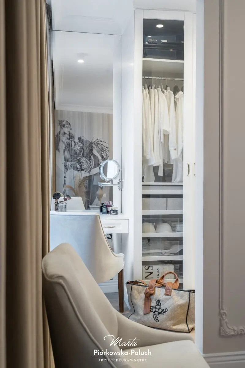 Garderoba, będąca niejako częścią sypialni, celowo nie posiada drzwi, a jedynie witrynowe fronty szafy, aby tapeta z sypialni odbijała się w lustrze toaletki i powodowała przenikanie do siebie obu wnętrz.