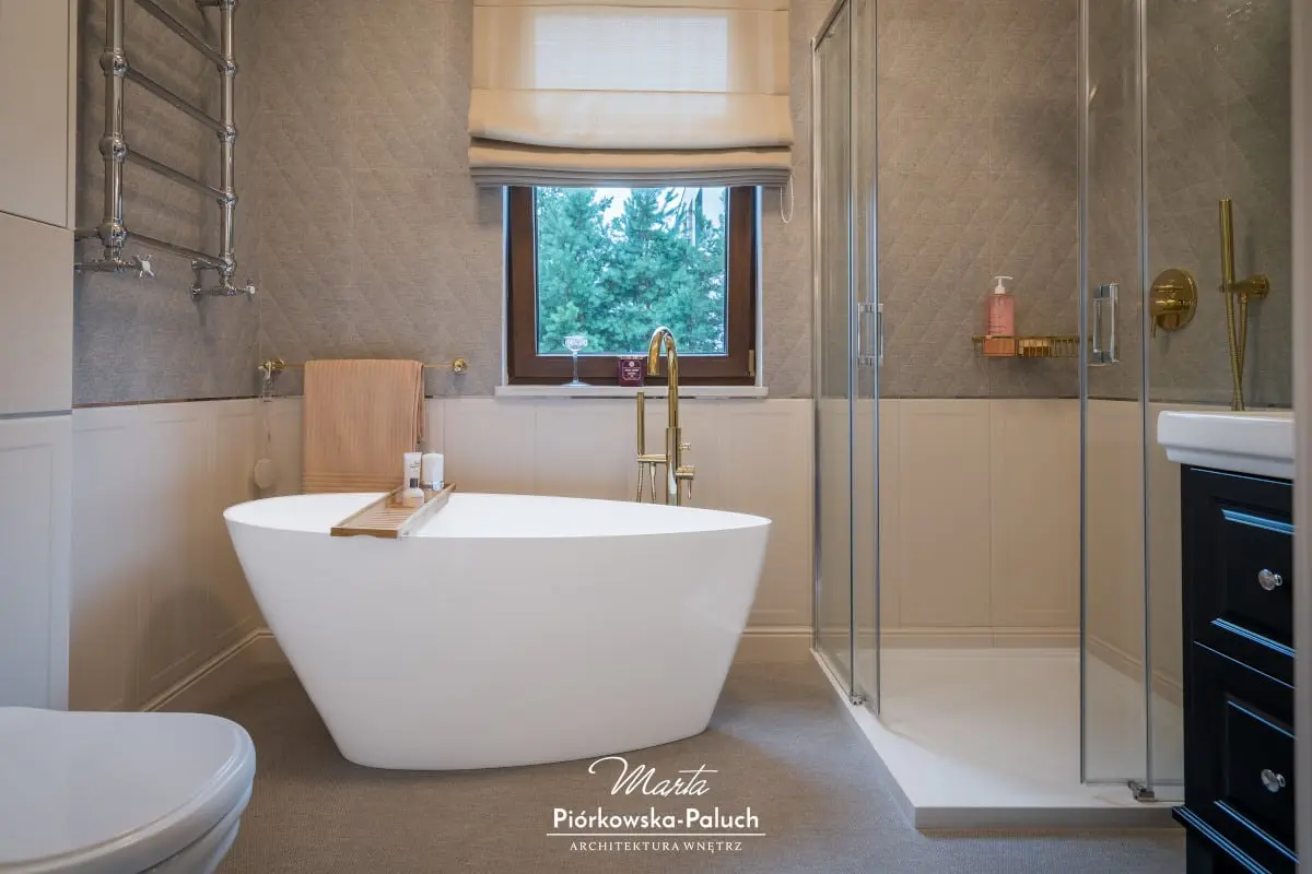 Elegancki salon kąpielowy z wanną wolnostojacą