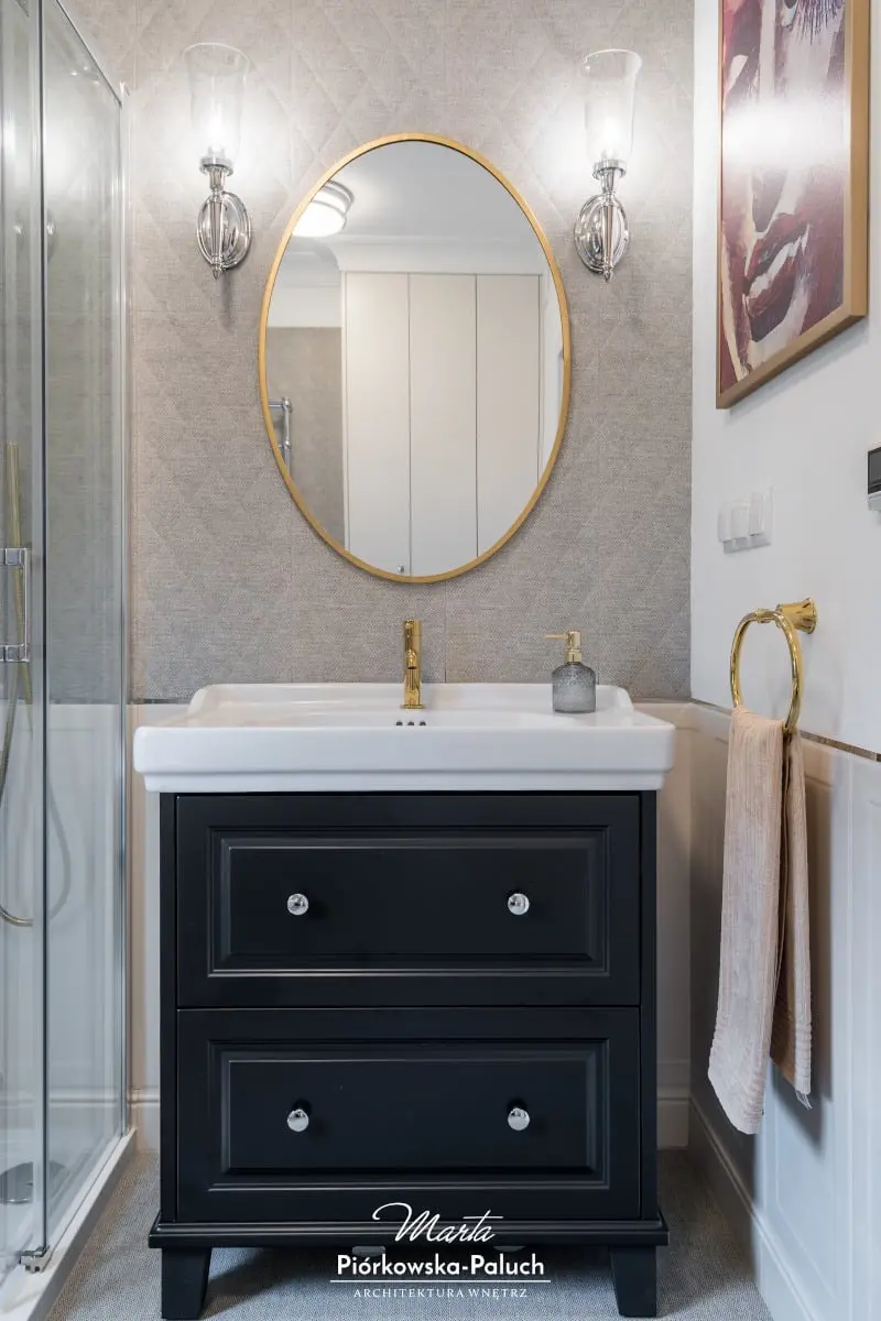 Projekt łazienki jest bardzo szykowny. Każdy jego element jest swoistą dekoracją. Złota armatura i stylizowany grzejnik podkreślają elegancki charakter aranżacji. Frezowana ceramiczna lamperia nadaje przestrzeni szyku, a efekt „pikowanej” okładziny – ciepła i przytulności.
