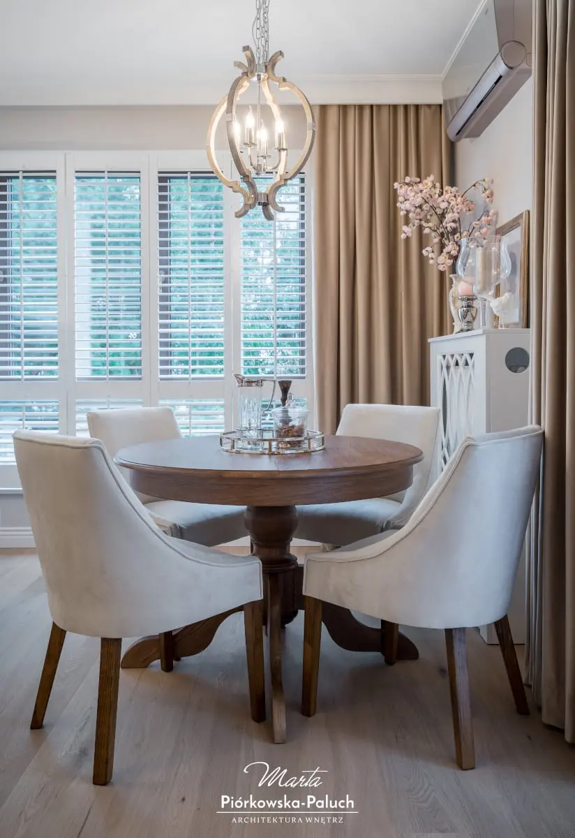 Okrągły stół wykonany na zamówienie idealnie wpisuje się w wystrój wnętrza. Dzięki temu, że jest rozkładany, bez problemu można przyjąć przy nim większą liczbę gości. W bliskim sąsiedztwie jadalni, za drewnianym przepierzeniem znajduje się dębowa kuchnia. Obecne tam retro sprzęty, kamienny blat, drewniane fronty i eleganckie płytki na ścianie nad blatem doskonałe dopełniają swoim eleganckim wyglądem przestrzeń dzienną.