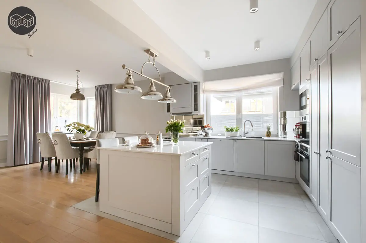 Elementem, który w tym projekcie symbolicznie rozgranicza dwie strefy jest funkcjonalna wyspa, nad którą wisi okazała niklowana lampa. Płycinowe, jasnoszare fronty kuchenne pięknie korespondują z blatami z konglomeratu kwarcowego imitującego marmur Calacatta. Akcentem dekoracyjnym, który sprawia że mieszkanie jest jeszcze bardziej eleganckie, są płycinowe sztukaterie.