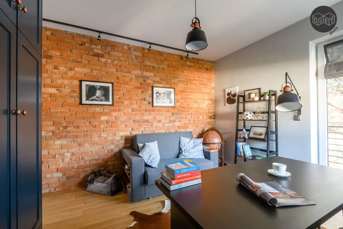 Gabinet jest w bardziej zdecydowanych barwach. Króluje tu naturalna cegła, granat, drewno i miedziane dodatki.