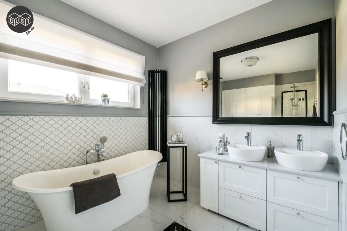 W łazience z wolnostojącą wanną i prysznicem znalazła się mozaika z koniczyny marokańskiej, a całość doprawiono czarnymi dodatkami w postaci półokrągłego grzejnika, czarnej ramy lustra oraz elementów ceramiki.