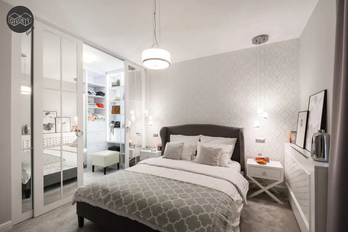 Sypialnię gospodarzy domu z wydzieloną garderobą, zaprojektowano w szarej kolorystyce z miękką wykładziną dywanową na podłodze. To rozwiązanie nie tylko sprawia, że wnętrze staje się bardziej przytulne, ale też poprawia akustykę (wycisza).