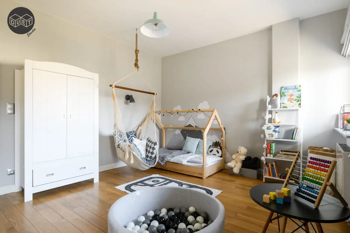 Pokój dziecka to połączenie ponadczasowej szarości z miętą i bielą.