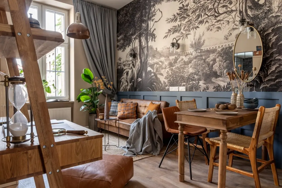 Ważnym elementem wystroju jest designerskie oświetlenie oraz wyselekcjonowane meble. Poza zabytkowym lustrem na klatce schodowej, na uwagę zasługują krzesła przy stole z litego drewna sheesham, które pochodzą z Indii. Wszystko to prezentuje się na tle botanicznej tapety zastosowanej powyżej stylowej lamperii.