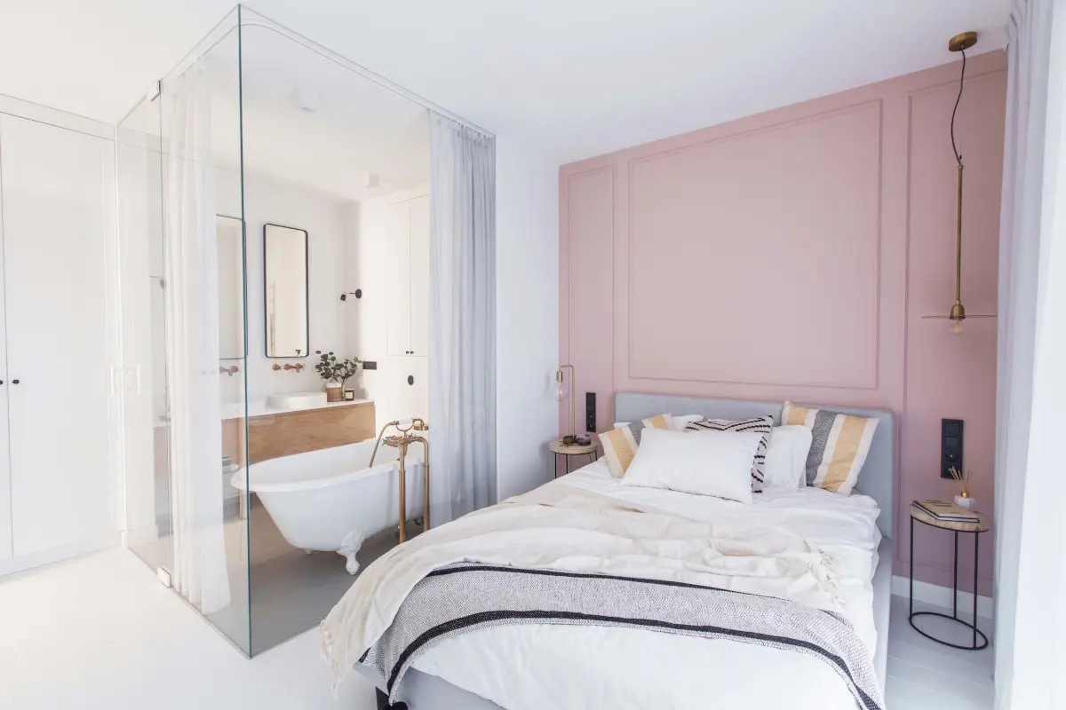 Sypialnia z salonem kąpielowym za przeszkleniem