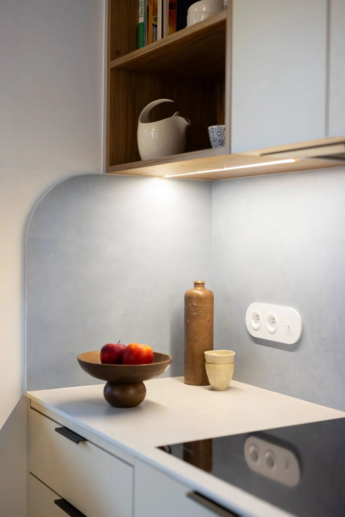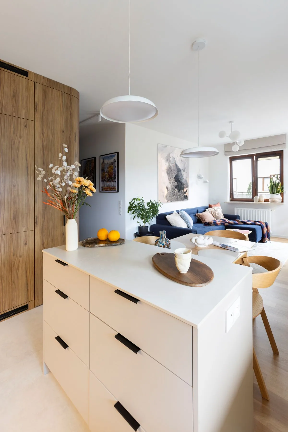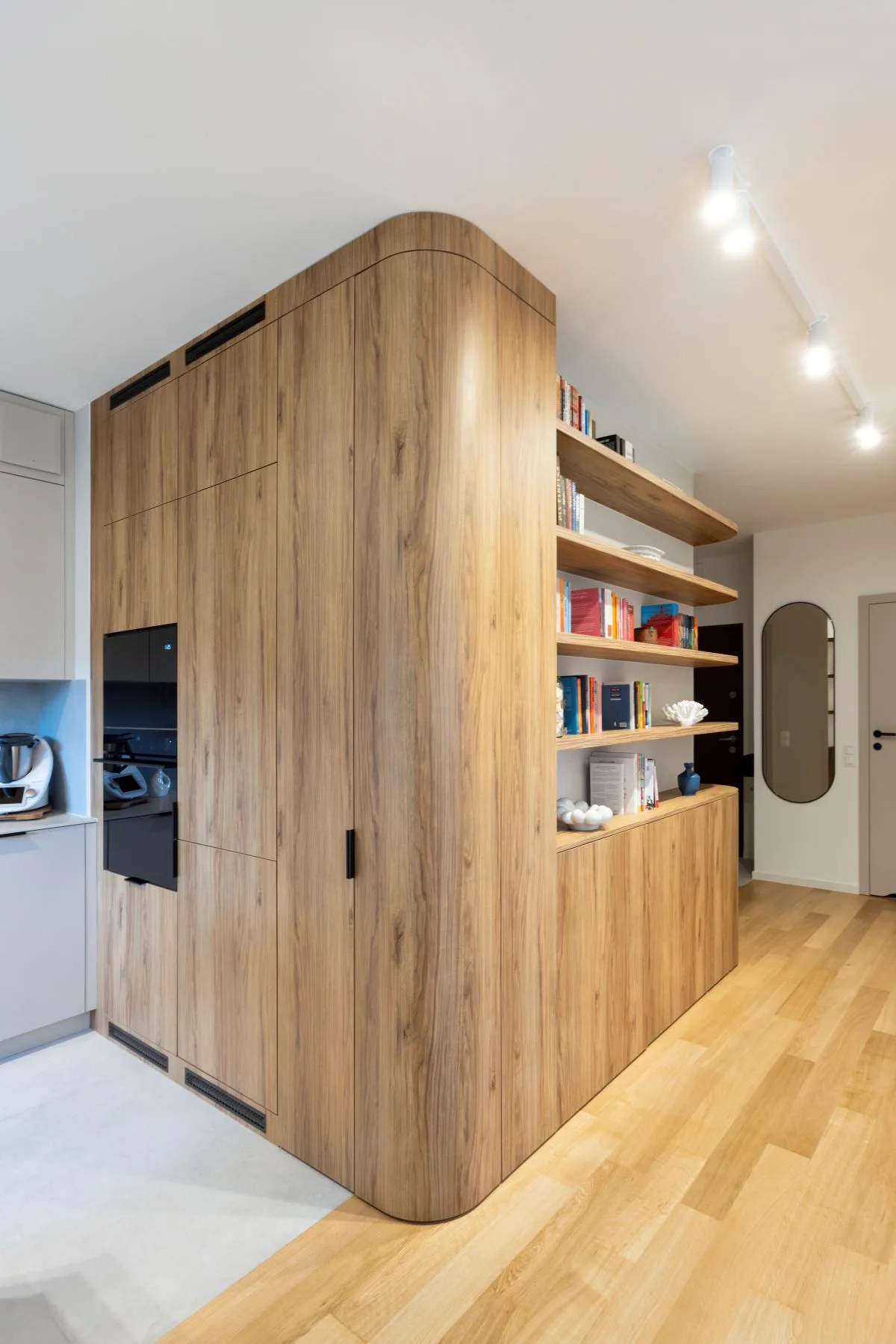 Centralnym punktem mieszkania jest kuchnia z wysoką zabudową zakończoną charakterystycznym łukiem. Łuk łączy aneks kuchenny z regałem w przedpokoju, nadając przestrzeni lekkości i ciągłości. To detal, który stał się znakiem rozpoznawczym projektów jlw studio – architektoniczny gest, który spaja przestrzeń i podkreśla harmonię.