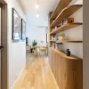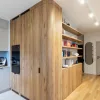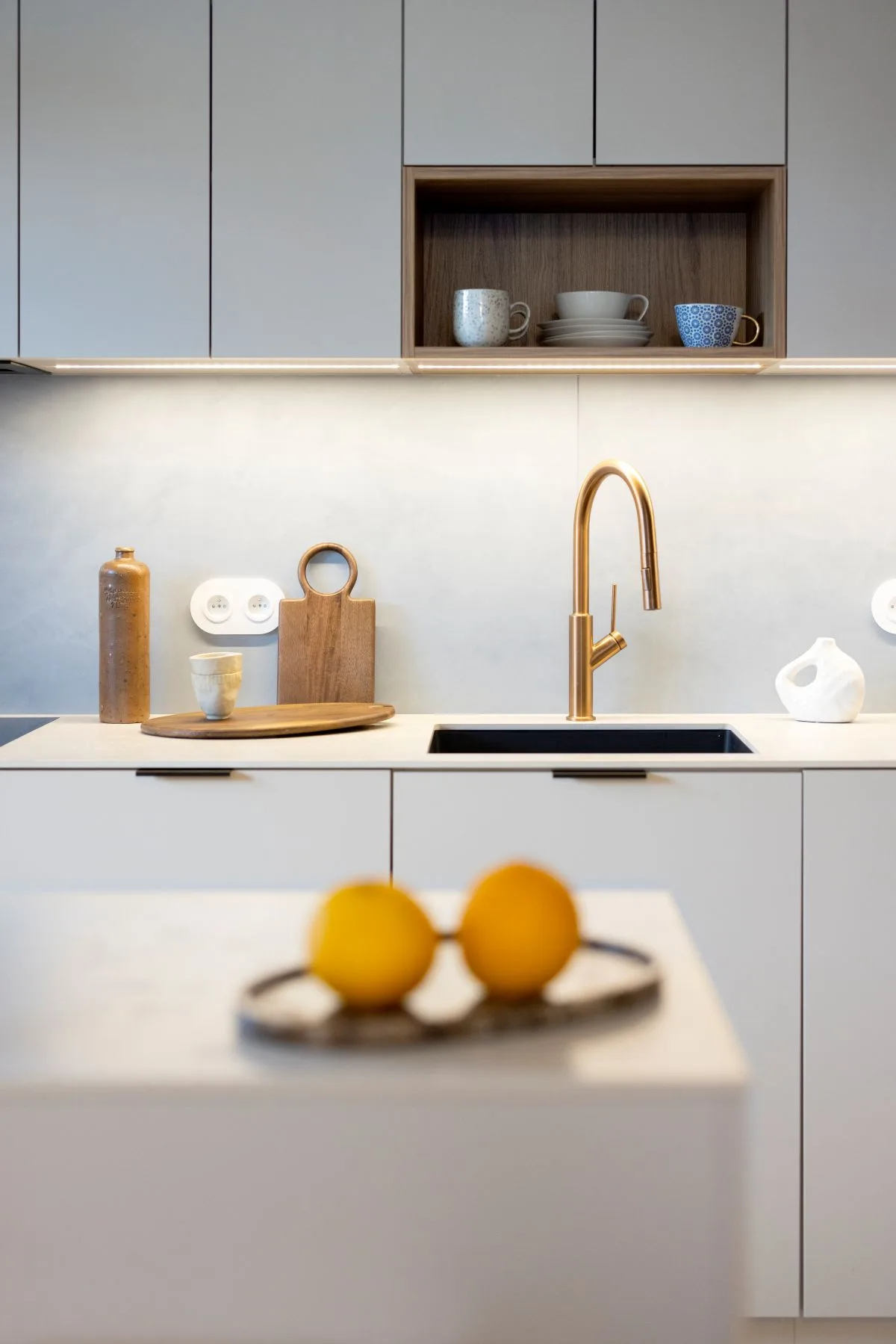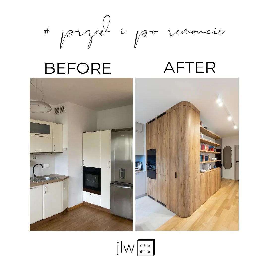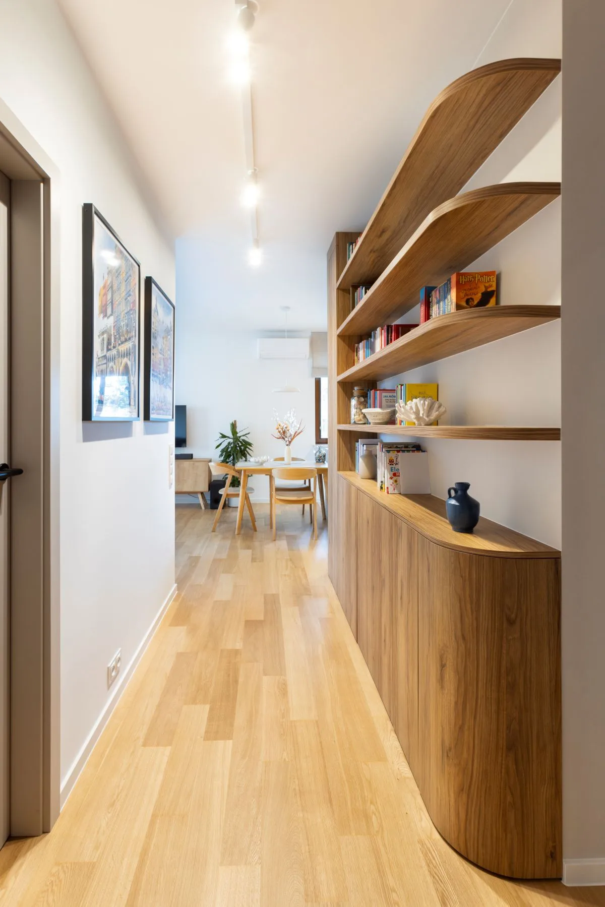 Centralnym punktem mieszkania jest kuchnia z wysoką zabudową zakończoną charakterystycznym łukiem. Łuk łączy aneks kuchenny z regałem w przedpokoju, nadając przestrzeni lekkości i ciągłości. To detal, który stał się znakiem rozpoznawczym projektów jlw studio – architektoniczny gest, który spaja przestrzeń i podkreśla harmonię.