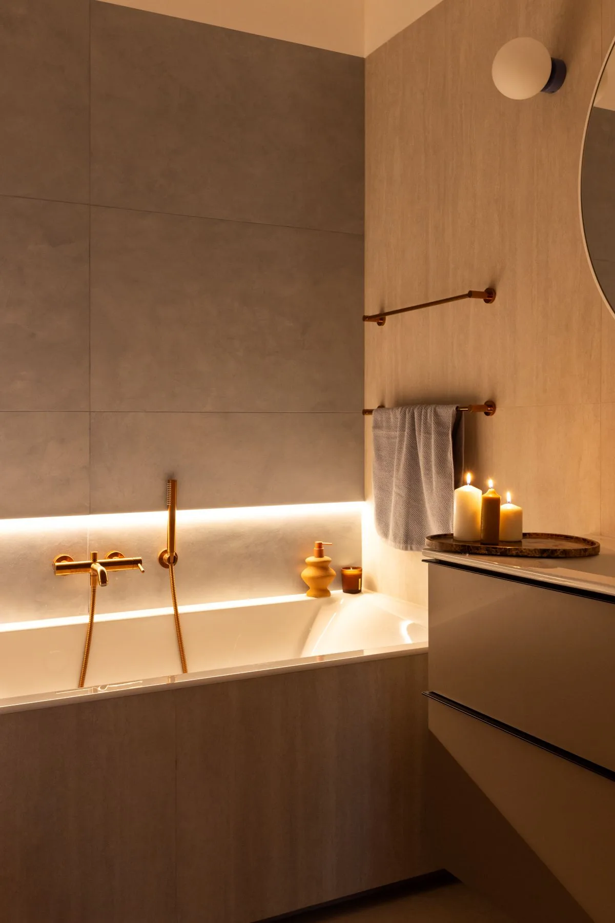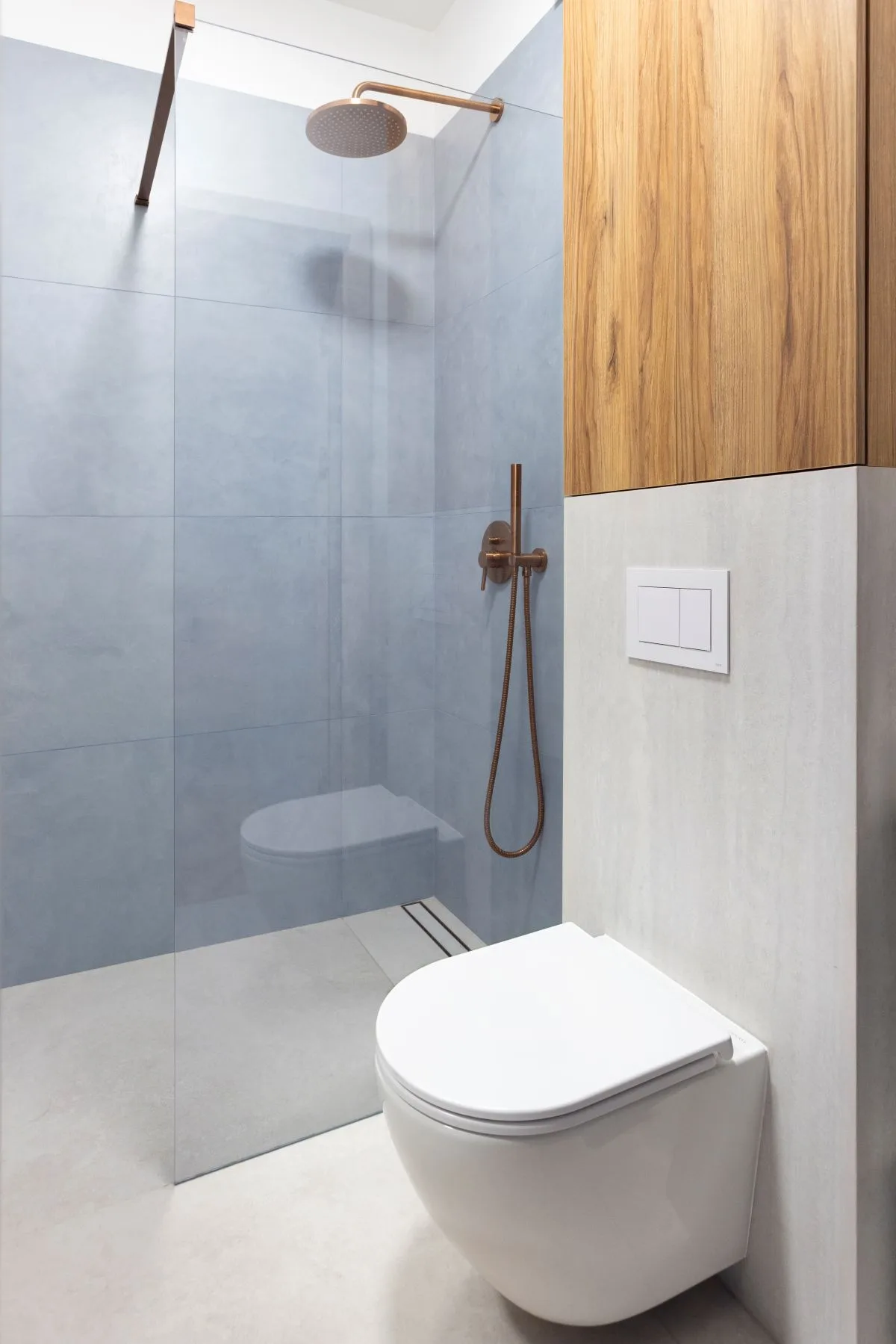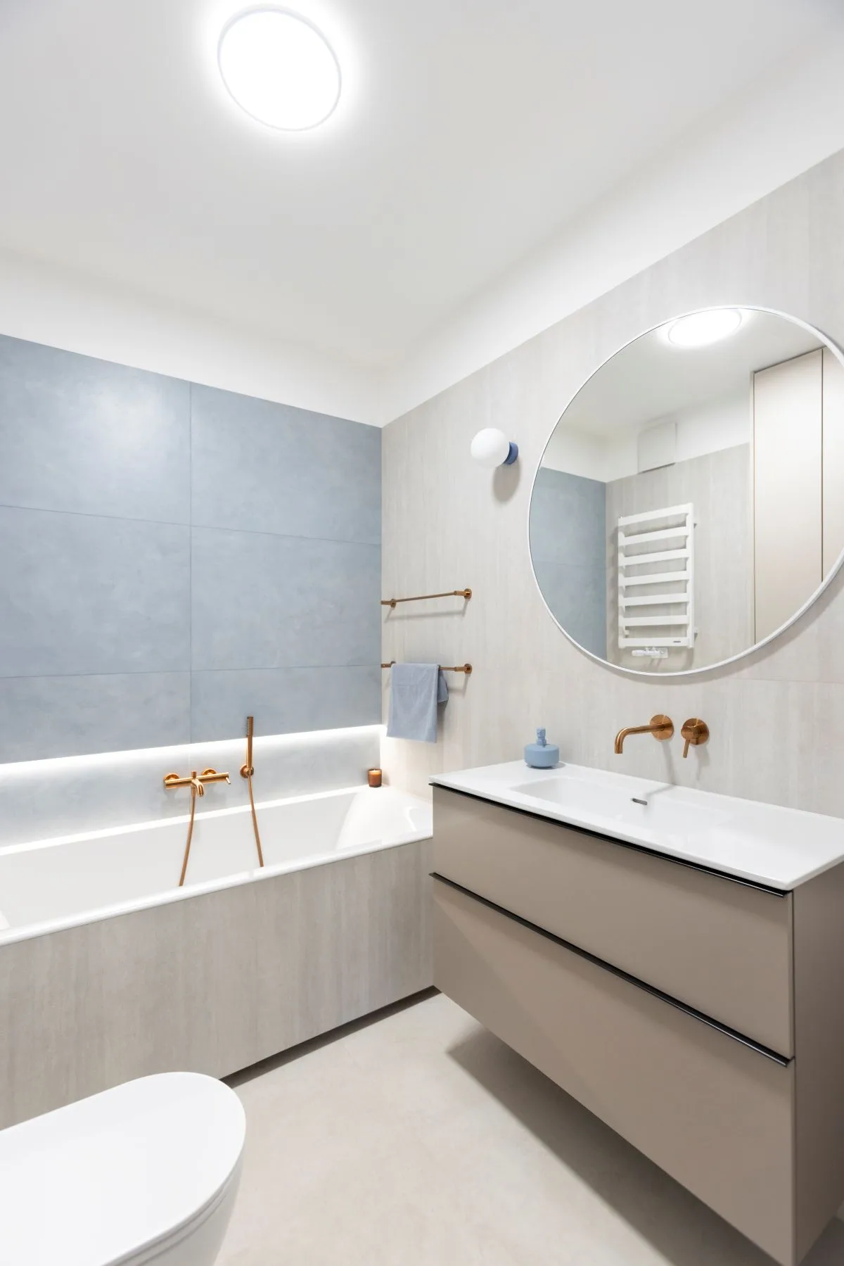 Bazą stały się beże, błękity i granaty, dopełnione miedzianą armaturą i ceglastymi akcentami. Taka paleta tworzy atmosferę przytulności, ale też elegancji i świeżości.