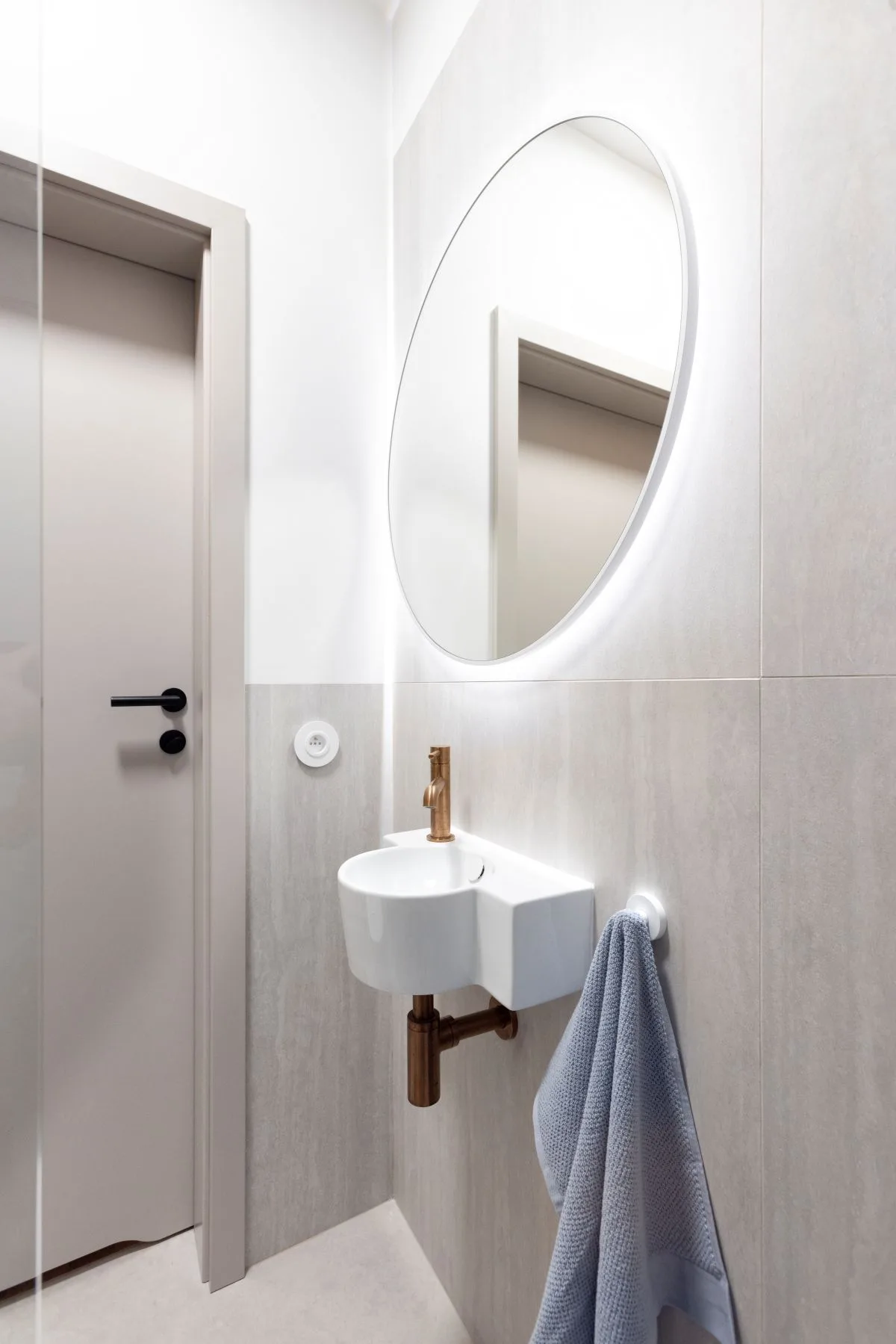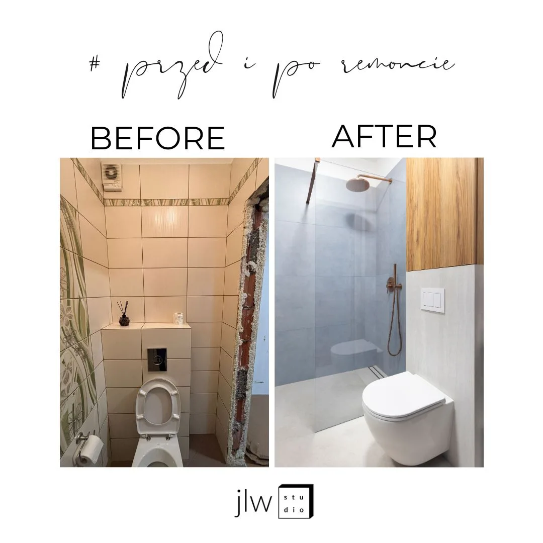 Największa metamorfoza dotyczyła strefy sanitarnej. Z niewielkiego WC powstała pełnowymiarowa druga łazienka z prysznicem, co znacząco podniosło komfort życia. Miejsce na nią udało się wygospodarować kosztem mało użytecznej wnęki kuchennej.