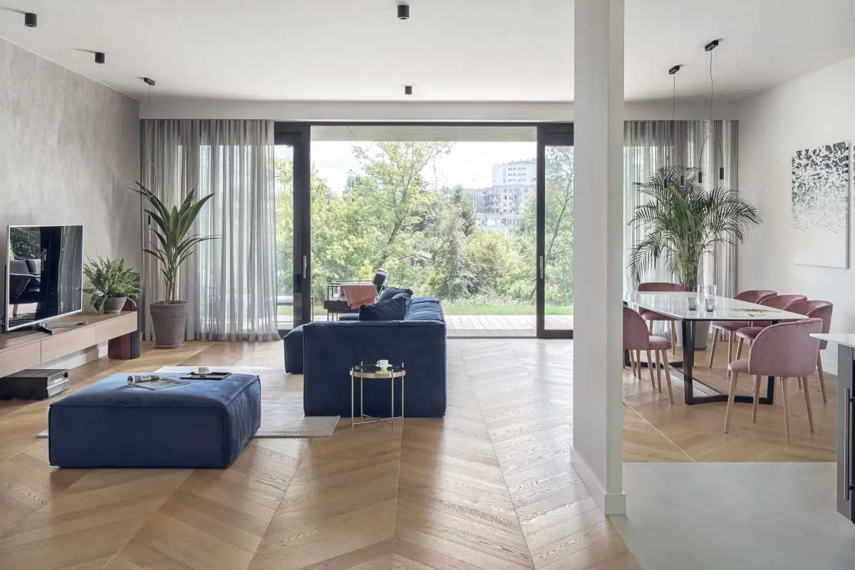 Najnowszy projekt Moniki Gruszki – Ziółkowskiej prowadzącej pracownię luumo. jest utrzymany w stylu nowoczesnym. Przeważające tu proste linie i uporządkowane strefy funkcyjne znajdujące się w otwartej przestrzeni tworzą wrażenie niezwykłej harmonii zaklętej w prostocie. Ogromną zaletą projektu jest ściana z okien, przez które wlewa się ogrom naturalnego światła.