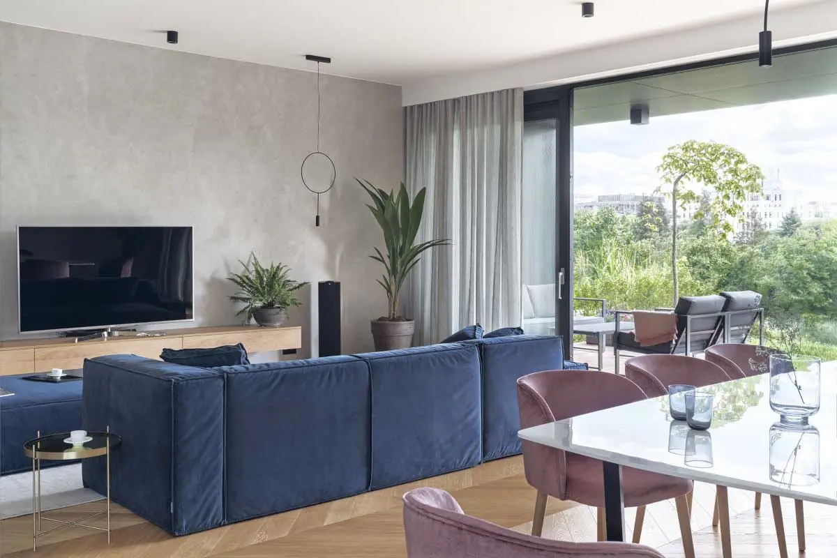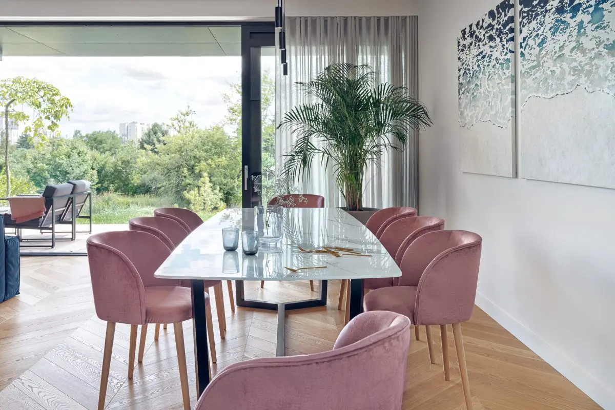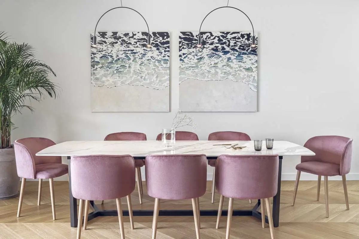 Równolegle do wypoczynku stoi duży jadalniany stół z marmurowym blatem. Jego cienka konstrukcja kontrastuje z wyrazistymi krzesłami. Pudrowo różowy welur dopełnia elegancki look stylizacji. ,,Kropką nad i” jest kompozycja stworzona z dwóch takich samych obrazów i opraw oświetleniowych.