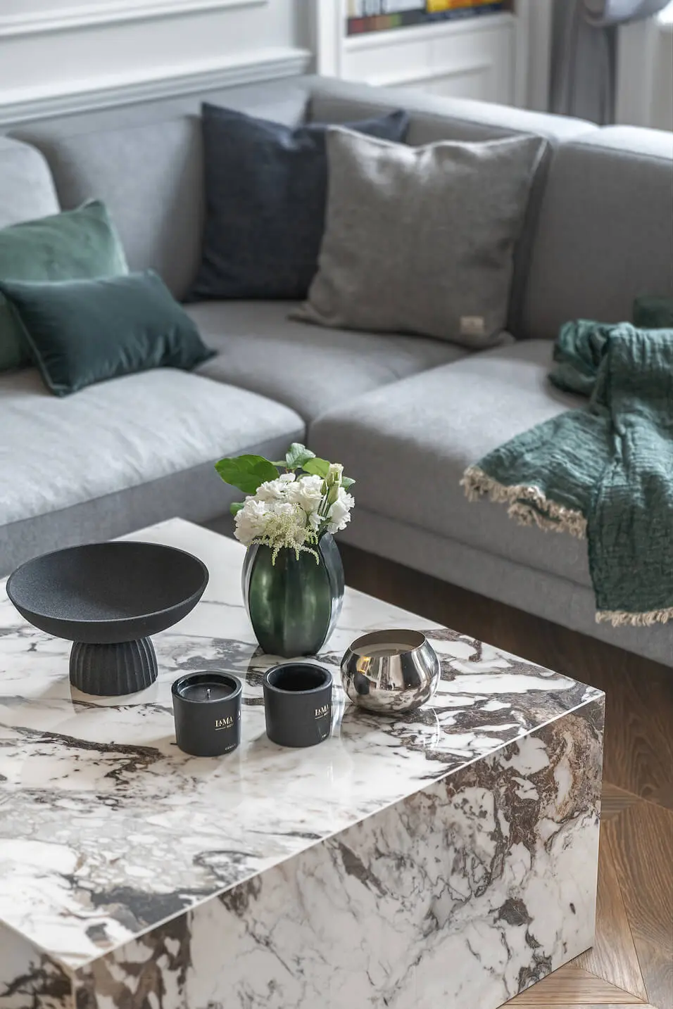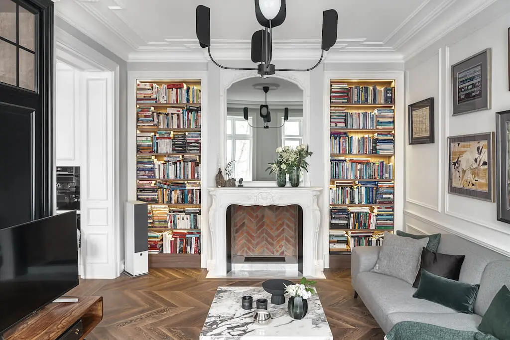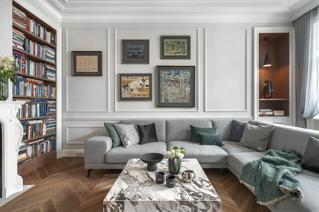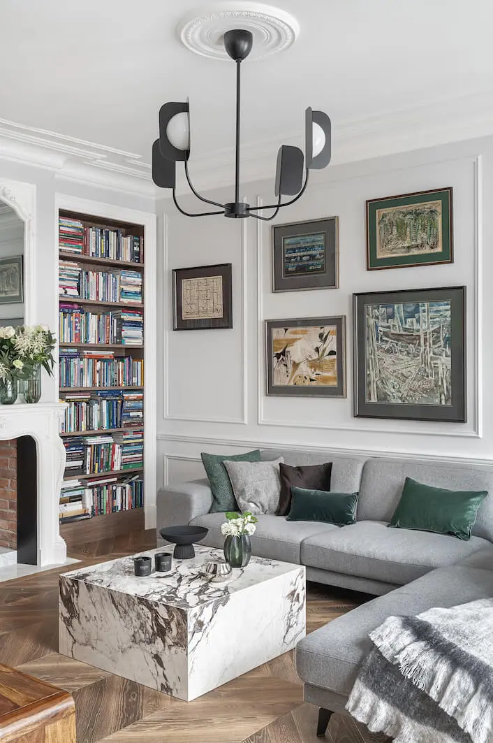W oparciu o oryginały opracowano sztukaterie i profile całej domowej stolarki nawiązujące do historycznych wzorów. Kontrapunktem do ścian w chłodnych bielach i szarościach, jest drewniany parkiet ułożony, w przeżywający ostatnio prawdziwy renesans wzór chevron. Głęboki brąz francuskiej jodełki na podłodze to jedyny ciemny akcent kolorystyczny. Inne barwy, pojawiające się na tkaninach czy dodatkach to delikatne, spłowiałe pastele. To celowy zabieg – zdecydowane kolory odciągałyby tylko uwagę od kolekcji współczesnego malarstwa zdobiącej ściany.