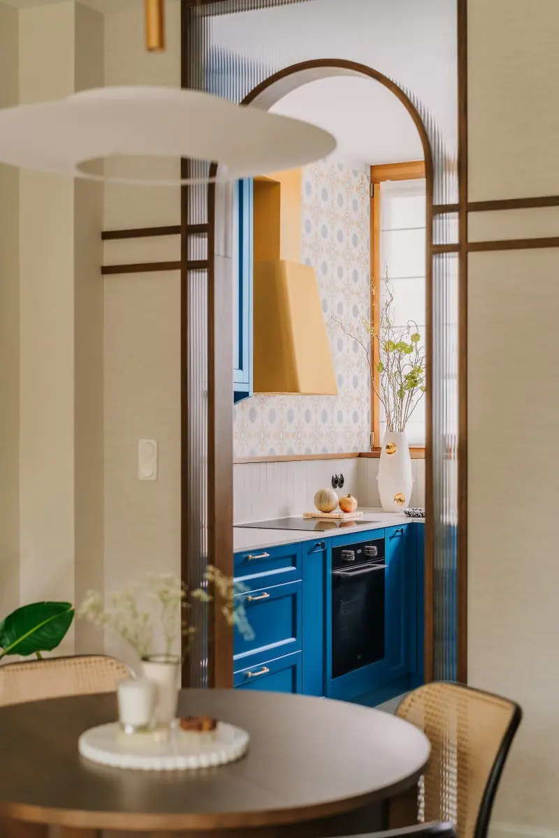 Ciekawym elementem aranżacji jest również łukowate wejście do kuchni, tym razem inspirowane stylem art déco. Kunsztowny charakter projektu podkreślają drewniane detale oraz tapeta tekstylna nadająca wnętrzom pożądanej przytulności. Zastosowane materiały i rozwiązania kreują domową rodzinną atmosferę, gdzie wartości takie jak gościnność czy otwartość znajdują przestrzeń.