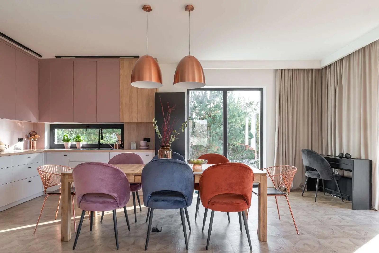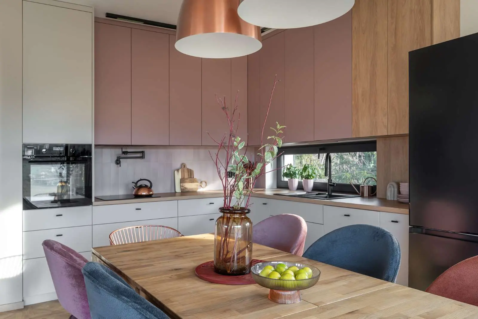 Fronty mebli kuchennych zostały wykonane z płyt meblowych o ultramatowej, nie brudzącej się powierzchni. W tej kolekcji jest kilkanaście niebanalnych kolorów, tutaj użyto brudnego różu w zestawieniu z beżem. Znakomicie pasują do tego płytki pomiędzy szafkami, marki Equipe, kolekcja Stromboli Rose Breeze. W kuchni zostało wykonane dodatkowe źródło wody, kran montowany w okolicach płyty grzewczej służący do napełniania wodą garnków. Między szafkami kuchennymi Marta zaprojektowała wąskie okno, przez które zagląda do domu zieleń. Celowo przy nim umieściła zlew, piękny widok umila wykonywanie typowych czynności kuchennych.