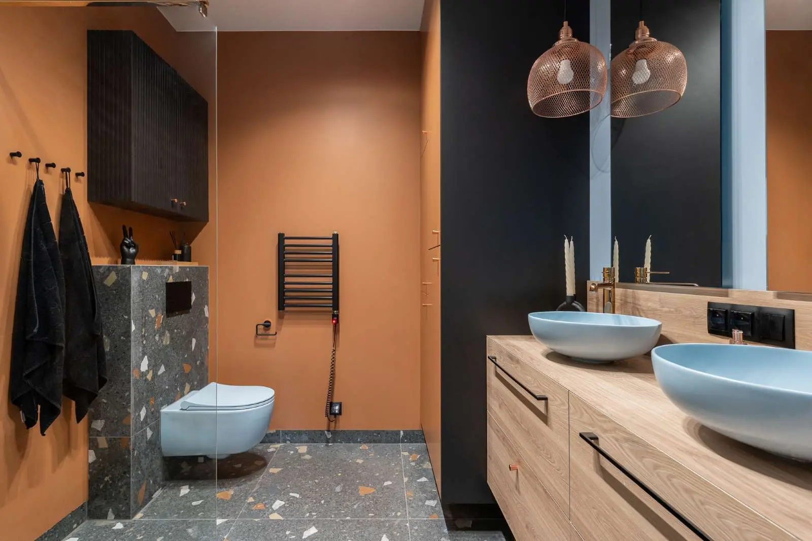Łazienka jest bardzo przytulna, kolorowa. Szafka umywalkowa została wykonana z płyty drewnopodobnej kompaktowej, bardzo odpornej na wodę i zarysowania. Dzięki łączeniu blatu i frontów pod kątem 45 stopni wygląda jak jedna bryła. Płytki lastryko zostały użyte na podłodze celowo, oprócz walorów estetycznych znakomicie sprawdzają się w codziennym użytkowaniu. Dodatkowo ich bogata kolorystyka wpasowała się w całościową koncepcję. Odważnie tu łączy się błękit z kolorem ceglanym, beżem i grafitem. Do tego miedziane dodatki, które są spójnym elementem aranżacji całego domu. Pod prysznicem został zastosowany kompozytowy brodzik brodzik prostokątny 120×80 cm z syfonem beżowy połączony z płytkami Tubądzin z niemal niewidocznymi fugami wygląda jak spójna jednolita bryła.