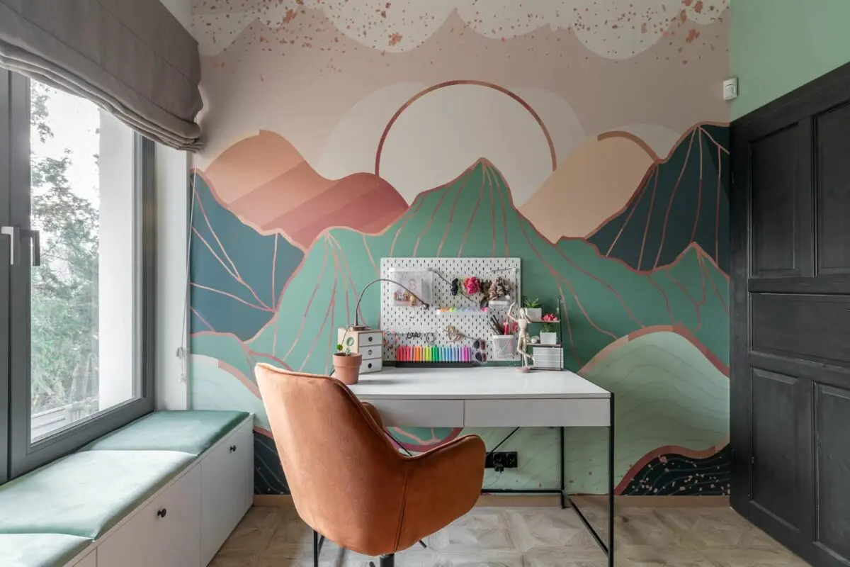 Pokój młodszej córki został zaprojektowany przez Martę w ścisłej współpracy z córką. To ona wybrała kolorystykę, łózko, fototapetę. Mama ubrała to w odpowiednią oprawę, tworząc pojemną zabudowę mieszczącą wszystkie skarby małej właścicielki pokoju. Wygodne siedzisko pod oknem to ulubiony element w pokoju dziewczynki, spędza na nim dużo czasu czytając książki i słuchając muzyki.