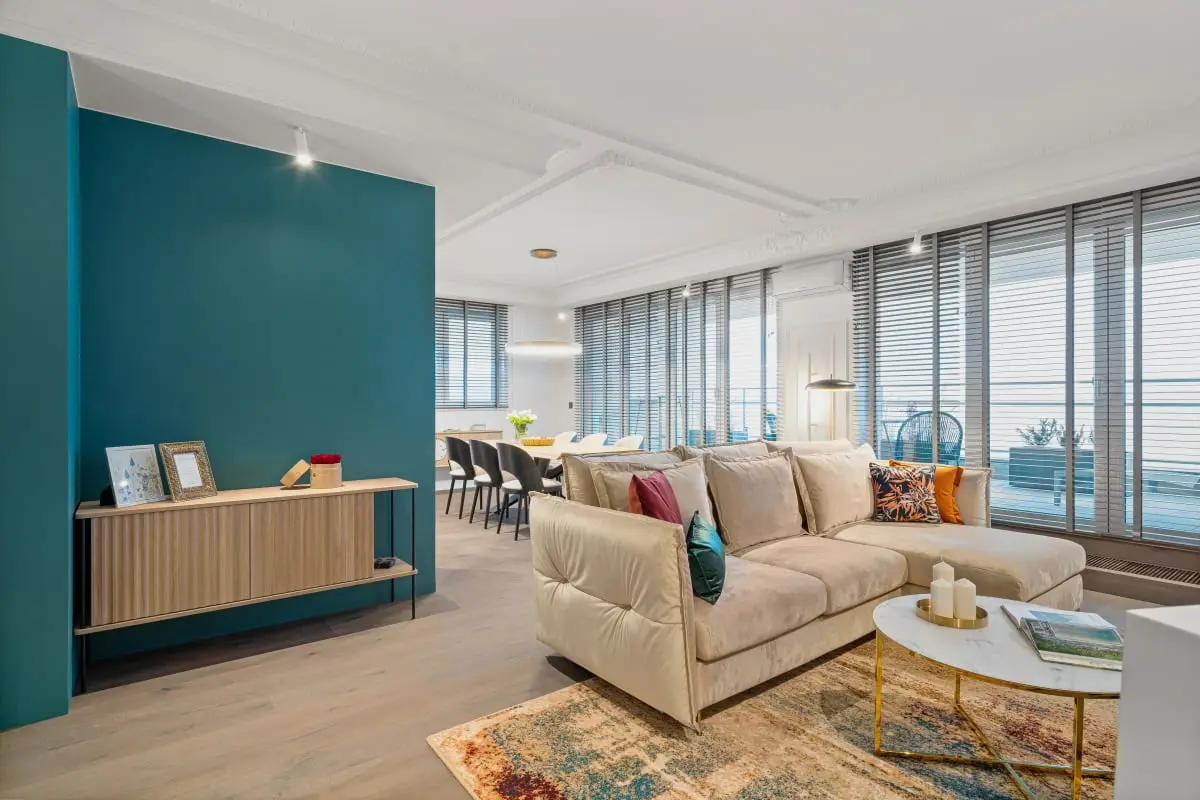 Właściciel mieszkania, z zawodu lekarz, chciał aby jego dom był miejscem, gdzie odpocznie po długim dniu w przychodni i zregeneruje siły. Stąd dość spokojny, harmonijny wystrój, poprzetykany mocniejszymi akcentami kolorystycznymi. Jednolita paleta barw i materiały przewijają się w całym mieszkaniu. Na całej powierzchni podłogi ułożono deski warstwowe. Nadające salonowi klasycznej elegancji sztukaterie powtarzają się, także w sypialni. Podobnie jak tkana tapeta z fakturą. Łóżko tapicerowane przyjemną welwetową tkaniną nawiązuje do koloru turkusowych ścian w części dziennej, a szafki nocne fornirowane naturalnym dębem do drewnianych elementów zabudowy.