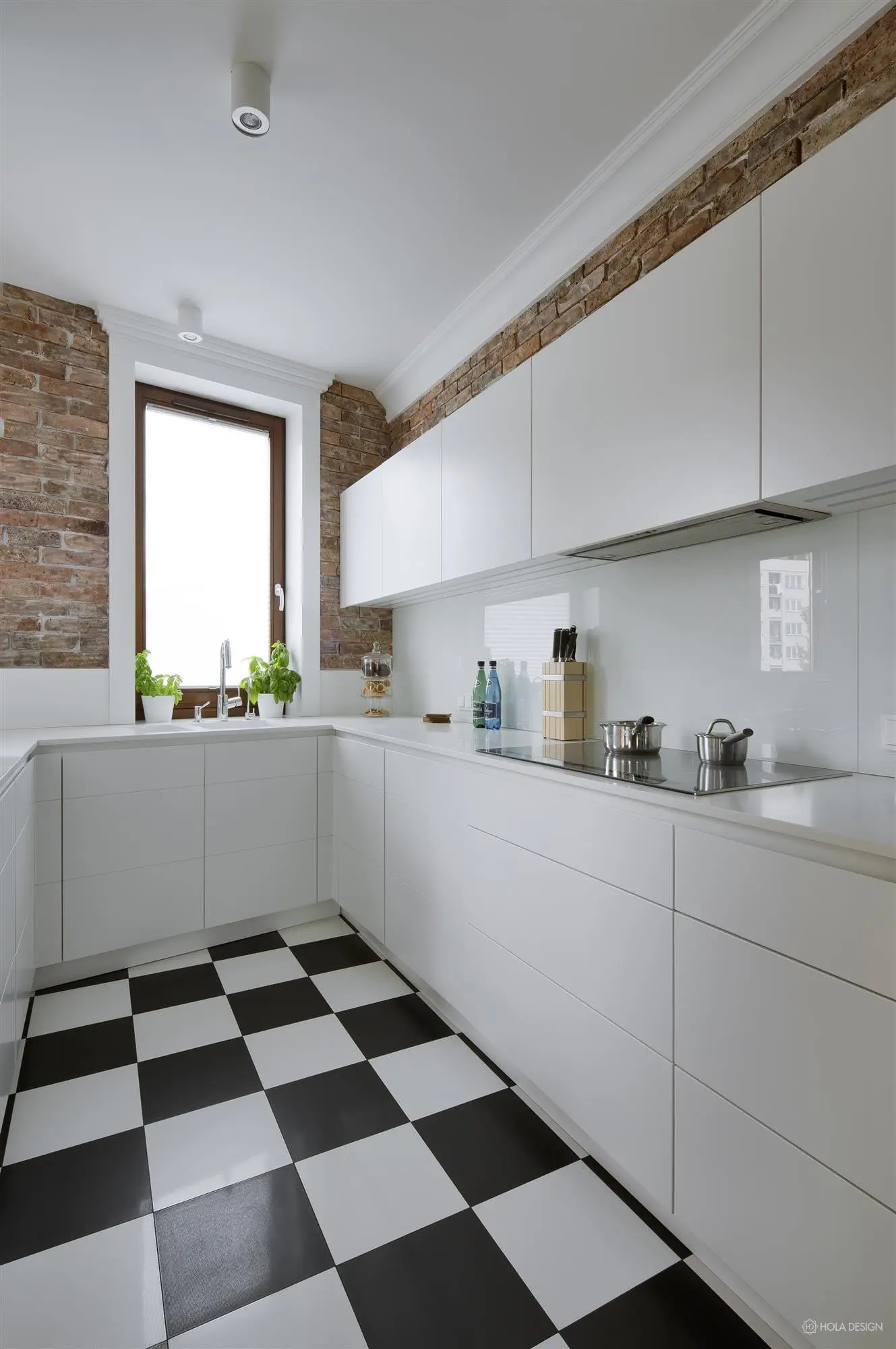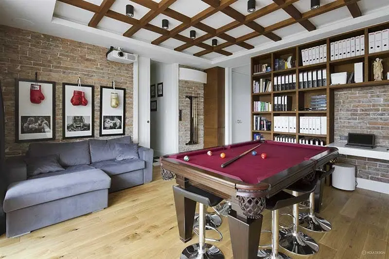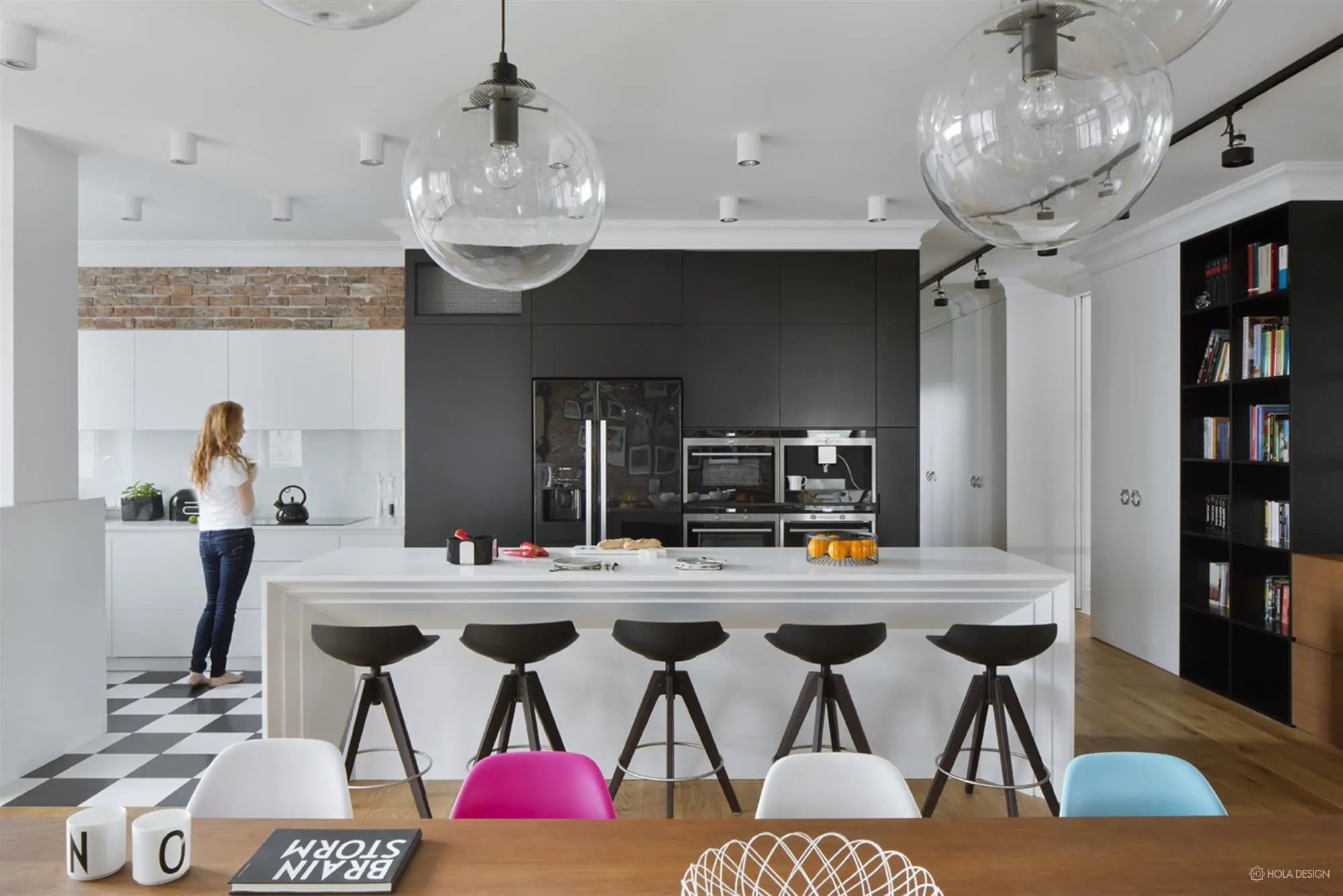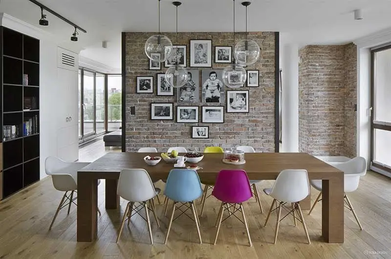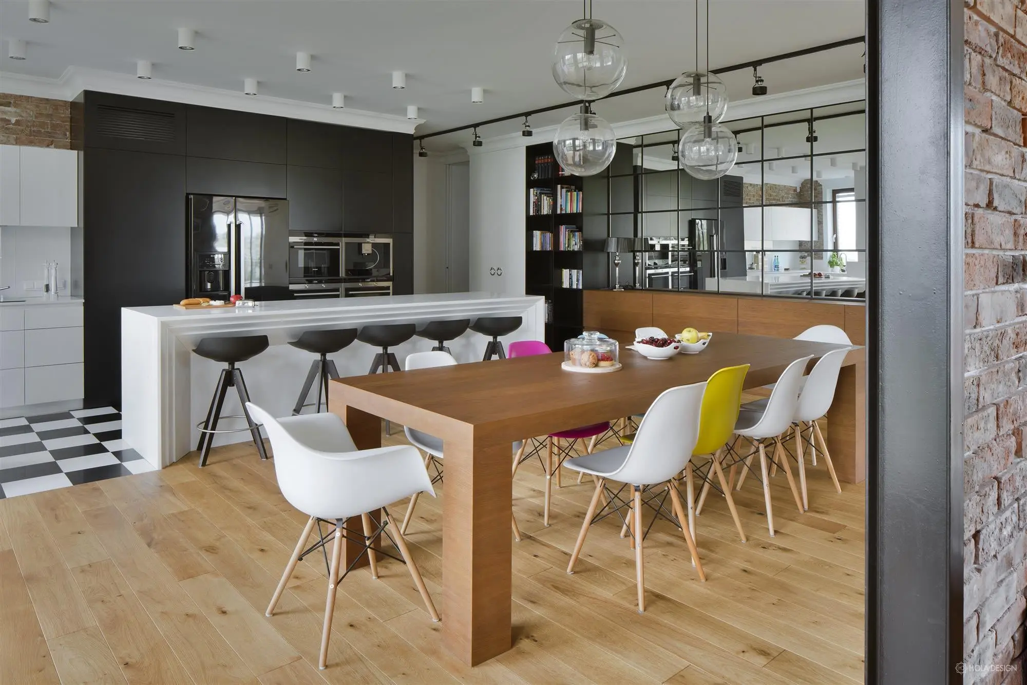 Eklektyczna mieszanka stylów w ramach jednego wnętrza, w którym jednak prym wiedzie industrialny klimat przejawiający się w zastosowaniu czerwonej cegły i charakterystycznego oświetlenia.