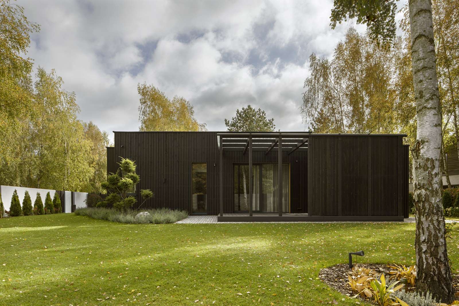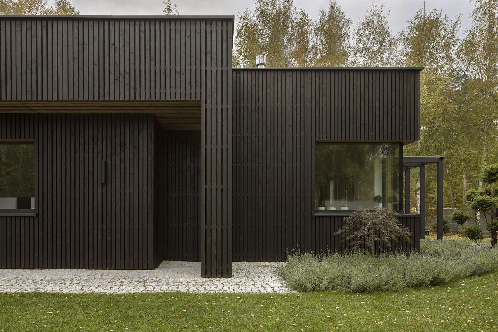 Bryła domu rzeczywiście przypomina drewno palone, jednak z wyjątkiem glifów okiennych i podbitki dachu.