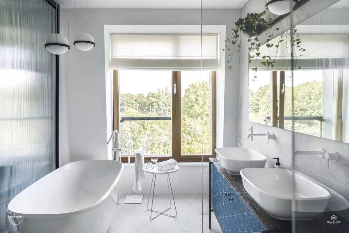 Zwróćmy uwagę na dekoracyjne lampy z rodziny Palma (marka Vibia), które znalazły swoje miejsce w salonie kąpielowym. Czy ktoś ma jeszcze wątpliwości co do tego, że przedmiot codziennego użytku może pięknie dekorować obraz wnętrza?