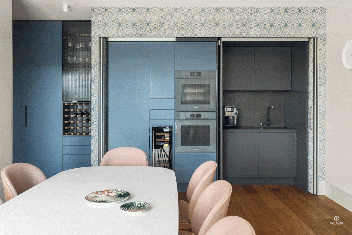 Zaprezentowane w dzisiejszym wpisie mieszkanie składa się z dwóch połączonych lokali o łącznej powierzchni 150 m2. Nadrzędna wytyczna, jaką jest możliwość ponownego podziału przestrzeni, podyktowała istnienie, poza główną kuchnią, dodatkowego aneksu w jadalni sprytnie schowanego w zabudowie meblowej. Podobnie zostały ukryte drugie drzwi wejściowe. Dzięki przemyślanym rozwiązaniom, nie ma wrażenia rozbicia przestrzeni na dwie części.