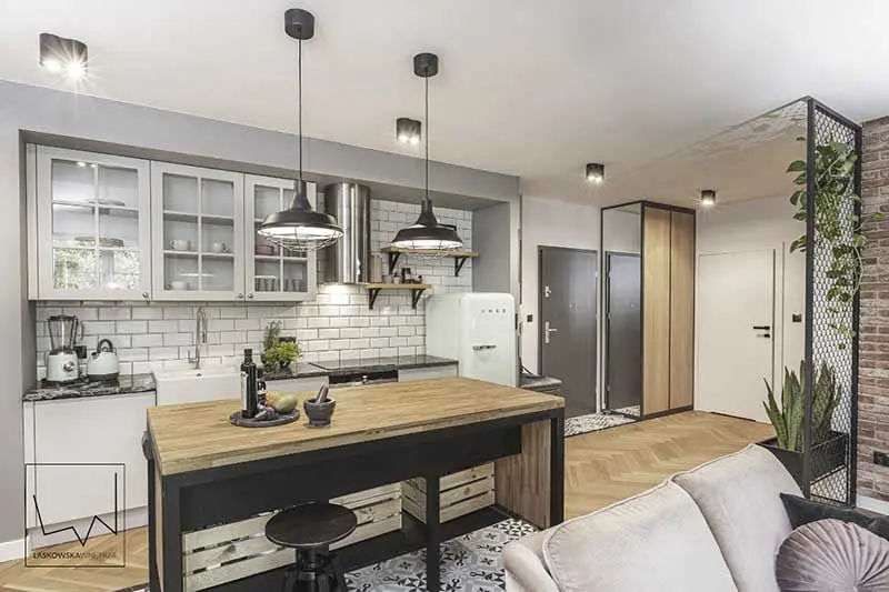 Aneks kuchenny konsekwentnie łączy styl skandynawski z loftowym. Jego mocny charakter zawdzięczamy czarnym oprawom, patchoworkowym płytkom pod wyspą i wykorzystaniu dużej ilości metalowych elementów. Całość rozmiękczają matowe fronty a także retro sprzęty AGD w miętowym wykończeniu. Białe kafelki podkreślają estetykę vintage. Tłem dla kuchni jest szarość, która dzięki swej neutralności sprawdza się w tej roli doskonale.