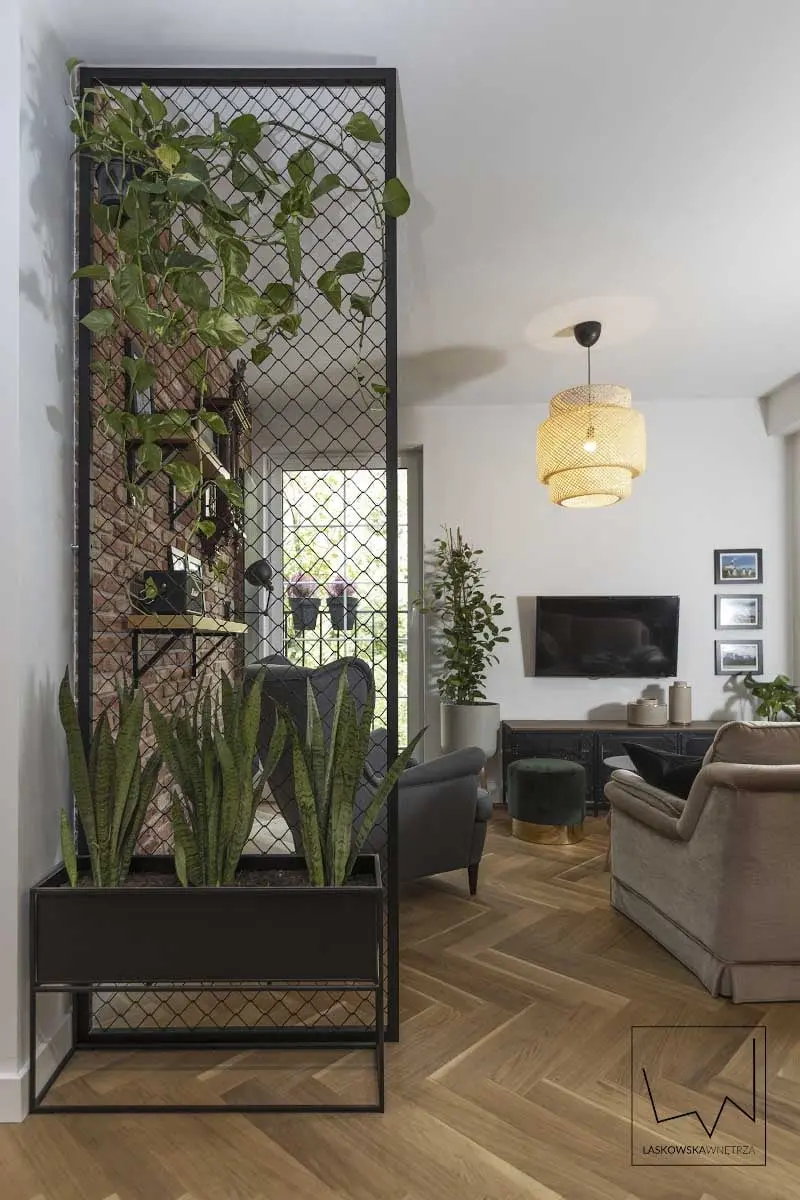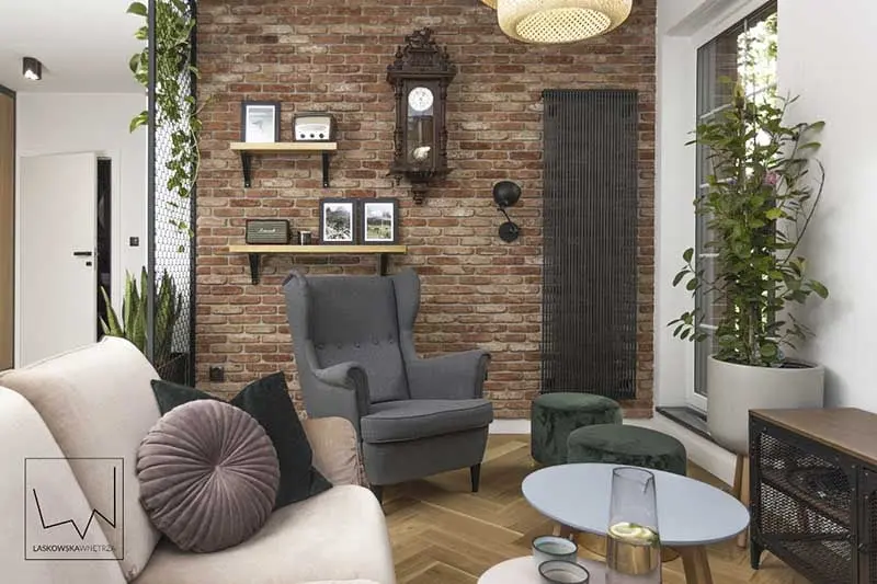 Jak wskazuje architektka jednym z najważniejszych elementów tego mieszkania stała się ściana z cegłą. Na niej osadziła stary zegar z duszą, który w ciekawy sposób kontrastuje z nowoczesnym grzejnikiem polskiej marki HushLab oraz równie piękną ażurową ścianką wykonaną z siatki ogrodowej w kolorze antracytowym. W ten sposób udało się połączyć tradycję z nowoczesnymi elementami charakterystycznymi dla loftowej estetyki.