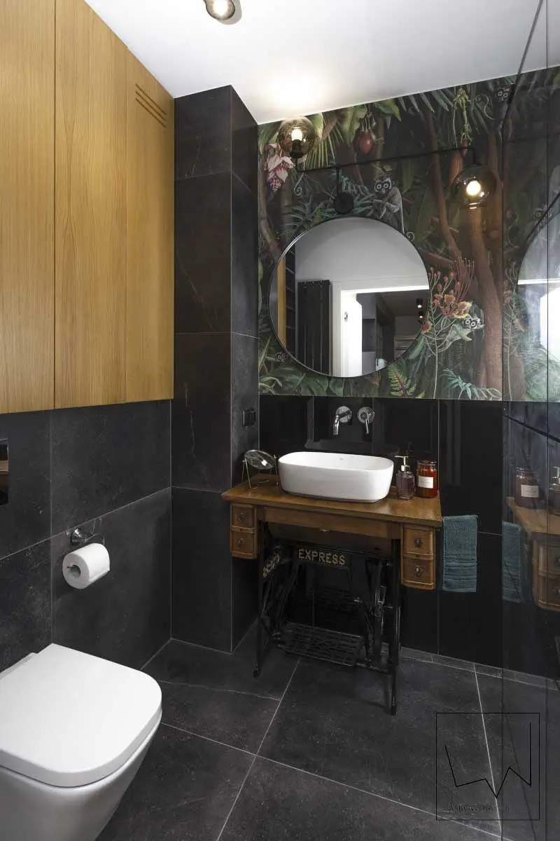 Powielenie harmonijnego łączenia stylu scandi i loftu znajdziemy także w łazience. Na pierwszy rzut oka chłodna w odbiorze łazienka jest w rzeczy samej przytulna dzięki przełamaniu dominującego stylu paroma kluczowymi elementami. Ciemne płytki występujące na ścianach i podłodze, architektka „zmiękczyła” fornirowymi frontami. Przeciwwagę dla płytek stanowi także tropikalna tapeta.