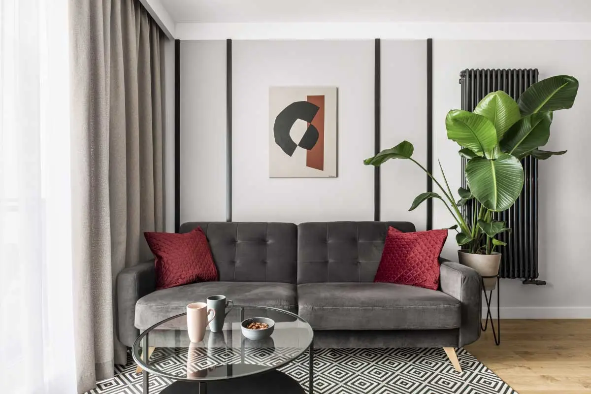 Architekci z PURA Design, postanowili przenieść hiszpański temperament i gorący klimat południa do Gdańska. Właśnie na północy Polski, powstało oryginalne mieszkanie zainspirowane twórczością Almodovara. Piękna, wiśniowa czerwień wita już od progu. Kolorem tym pokryte są frezowane panele, które stanowią ciekawą dekorację ściany, wydzielającą strefę korytarza. Jednocześnie, ścianka ta pozwoliła stworzyć wąską niszę, gdzie znalazł się aneks kuchenny. Tutaj śródziemnomorski sznyt uzyskano dzięki zastosowaniu lastryko, nad blatem. Aneks uzupełnia klasyczny, drewniany stół jadalniany z kompletem krzeseł, który uspokaja aranżację. Nad nim zawisła lampa z czerwonym kloszem, nawiązującym do koloru frezowanej ścianki. Strefę wypoczynkową wyposażono w welurowy zestaw: szarą sofę oraz musztardowy fotel. Akcenty barwne powtarzają się na poduchach dekoracyjnych oraz abstrakcyjnym obrazie, wiszącym nad kanapą. Drewniana komoda w stylu mid-century, która pełni rolę szafki RTV, dopełnia styl wnętrza. Natomiast bujna roślinność przywodzi na myśl południowy klimat.