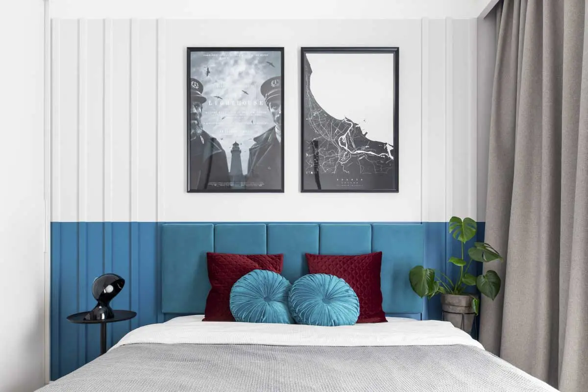 Prywatna część mieszkania, gdzie znajduje się sypialnia, nie została pozbawiona nasyconych barw. Tutaj architekci z PURA Design postawili na głęboki, morski odcień błękitu. Wykorzystali go w lamperii znajdującej się za łóżkiem, a także jako obicie welurowego zagłówka. Regał, pełniący rolę biblioteczki, również pokrywa błękit. Intensywna barwa została złagodzona bielą ścian i szarymi dodatkami tekstylnymi. Charakteru aranżacji nadają czarne elementy tj.: skrzynia łóżka, oświetlenie, w tym lampka nocna Dalu marki Artemide oraz plakaty, nawiązujące do filmowej pasji właścicieli.