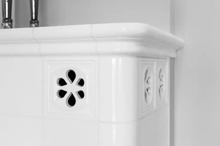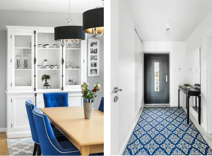 Na szczęście w tym przypadku jest inaczej, bowiem został on dopieszczony w każdym najmniejszym detalu oraz jest spójny ze stylistyką całego domu. Drzwi idealnie korespondują ze stylową konsolą w ludwikowskim stylu, a na podłodze pojawił się „chodnik” ułożony z wzorzystych płytek. Doskonały koncept!