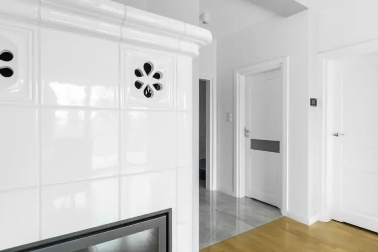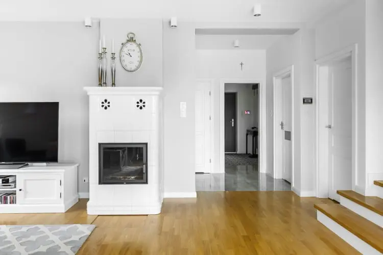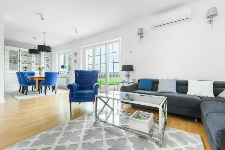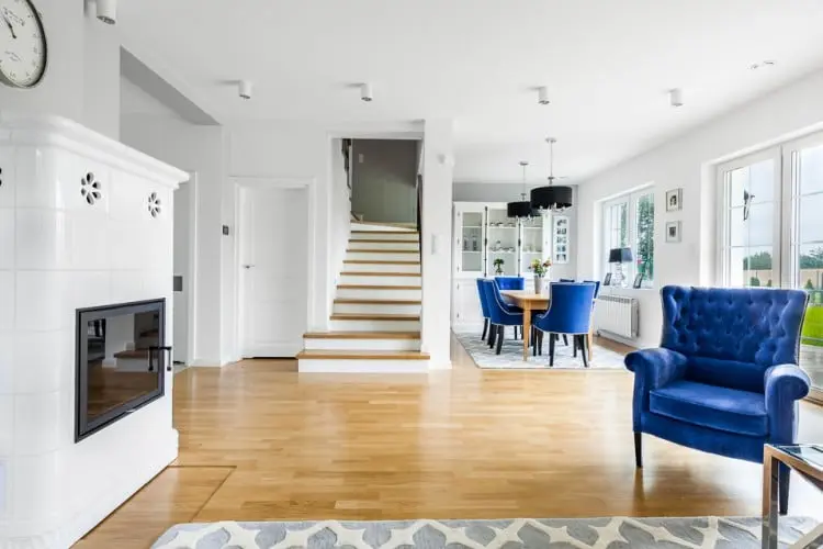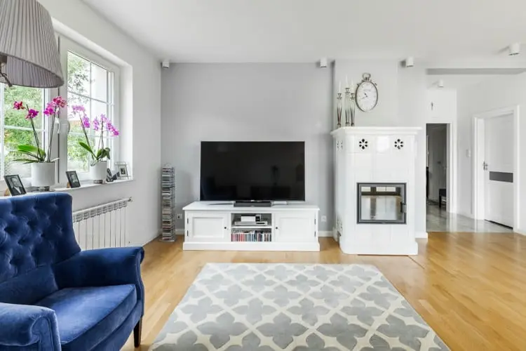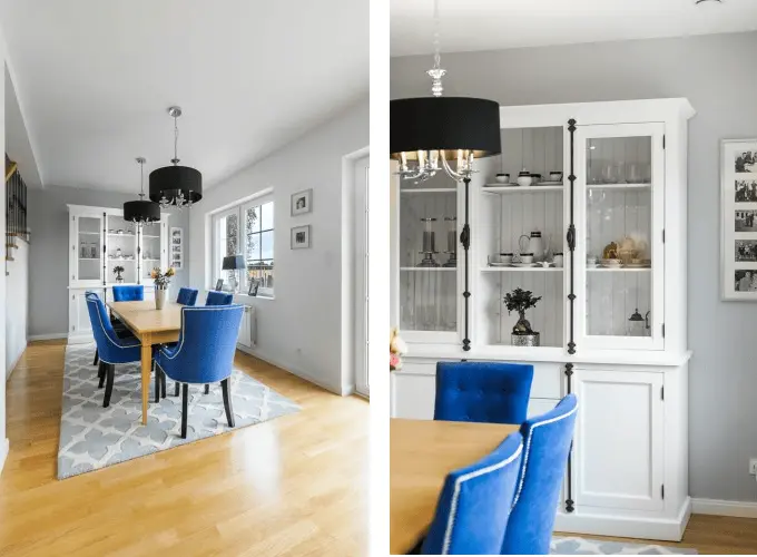 Ściany zdecydowano się pokryć szarą stonowaną farbą, która stanowi doskonałe tło dla pięknych eleganckich form mebli oraz dostojnych żyrandoli dumnie wiszących obok oświetlenia technicznego. Dostojności temu wnętrzu dodają pikowane meble, dywany we wzór przypominający koniczynę marokańską, które przywołują do domu odrobinę stylu hampton oraz ponadczasowa drewniana podłoga. Punktem przykuwającym uwagę jest również kominek stylizowany na stary kaflowy piec.