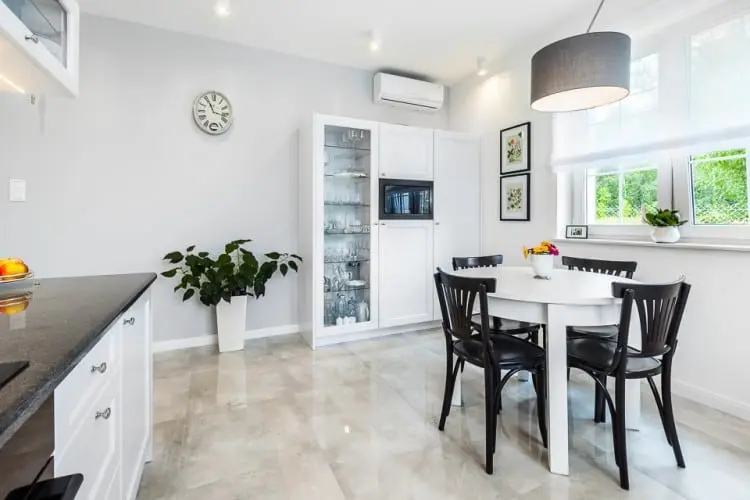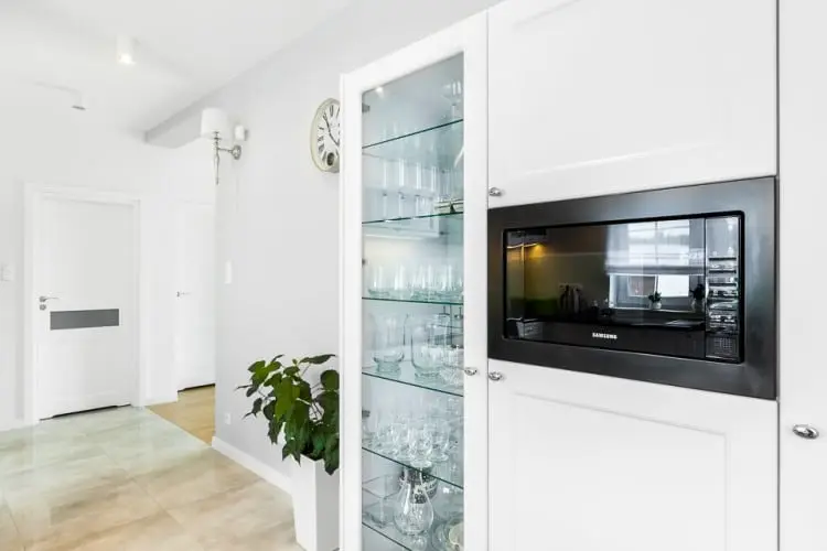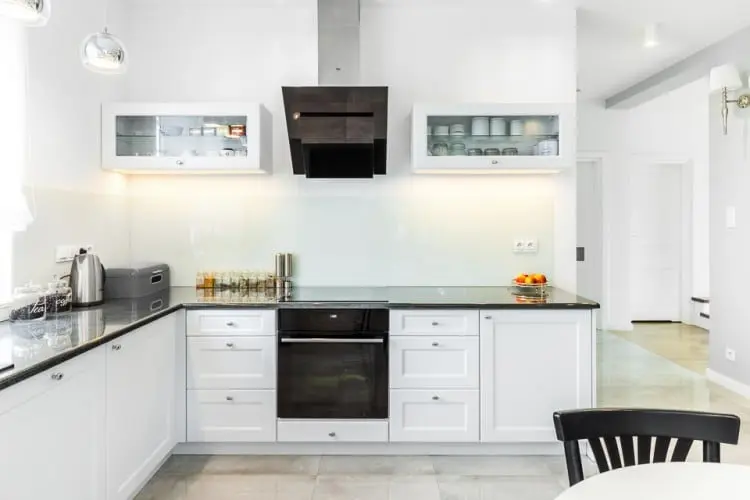 Kuchnia została zaprojektowana w nowoczesnym stylu. Przejawia się to w zastosowanej kolorystyce oraz przewadze prostych linii. Jednakże są elementy, które sprawiają, że przestaje być oczywistą aranżacją. Okrągły biały stół w towarzystwie klasycznych krzeseł w czarnym wybarwieniu oraz nowoczesna, ale jednak witryna, zdają się zaprzeczać nowoczesności, sprawiając że kuchnia jest nieco przytulniejsza.