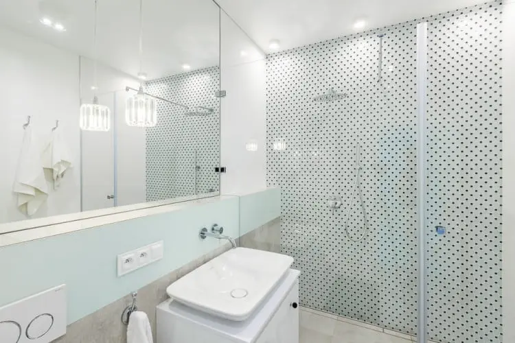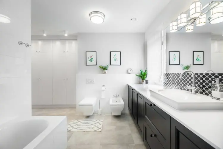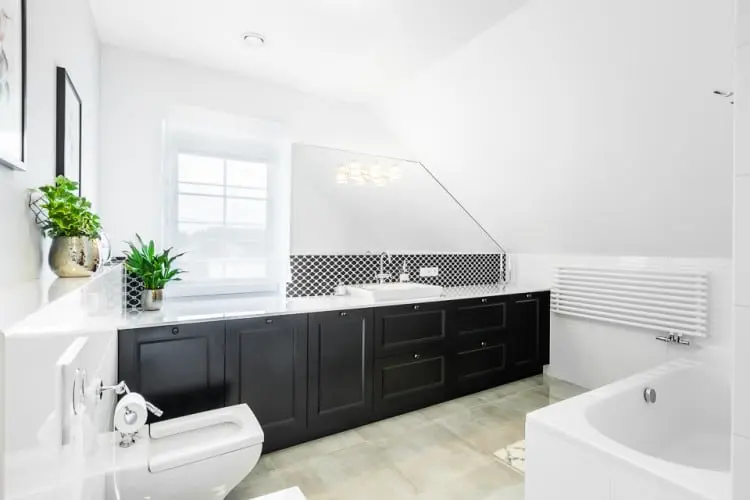Aranżacje łazienek również zachwycają, mnie przede wszystkim ta przedstawiona poniżej. Zestawienie czerni i bieli to już klasyka, która nigdy nie ma prawa wyjść z mody. Łazienka utrzymana w takiej kolorystyce jest wspaniałą alternatywą dla białych, szarych czy biało – drewnianych projektów tego wnętrza.