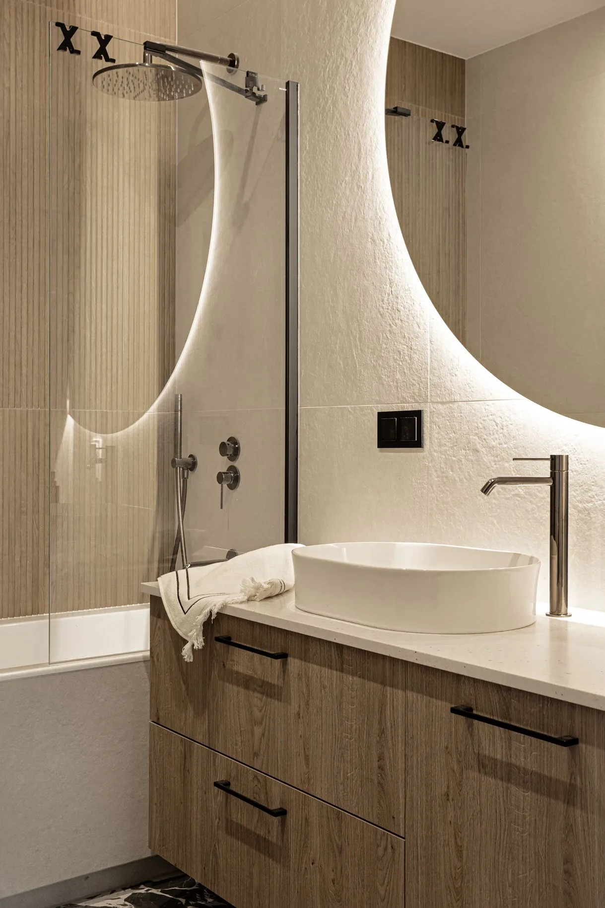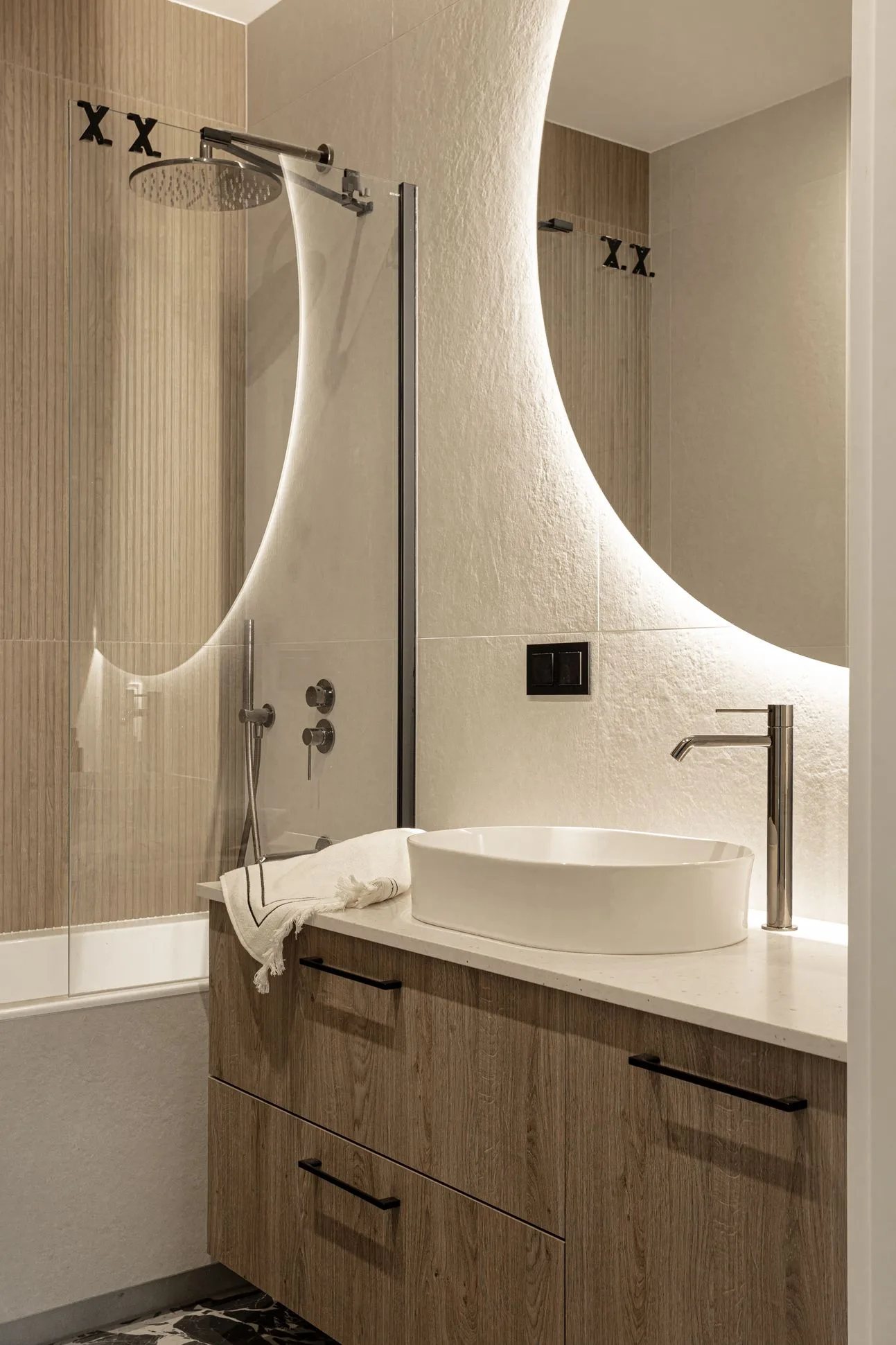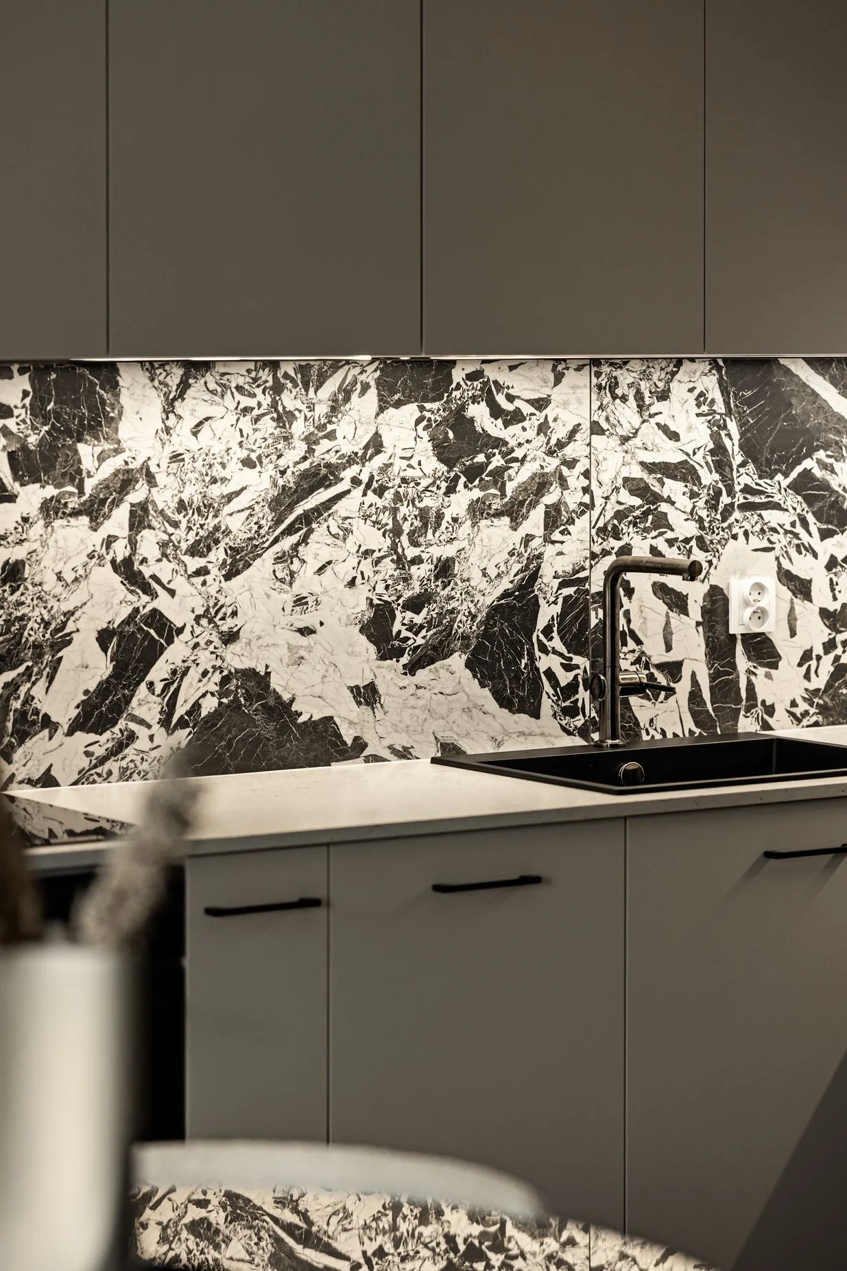 Charakter wnętrza podkreślają czarno-białe płytki 41zero42, które wprowadzają nutę graficznego pazura. Ich geometryczny rytm przełamuje miękkość kolorów i wprowadza nowoczesny ton. Całość dopełnia oświetlenie o rzeźbiarskich formach – od subtelnych kinkietów po designerskie lampy wiszące. To właśnie one budują klimat i wydobywają strukturę zastosowanych materiałów.