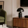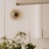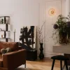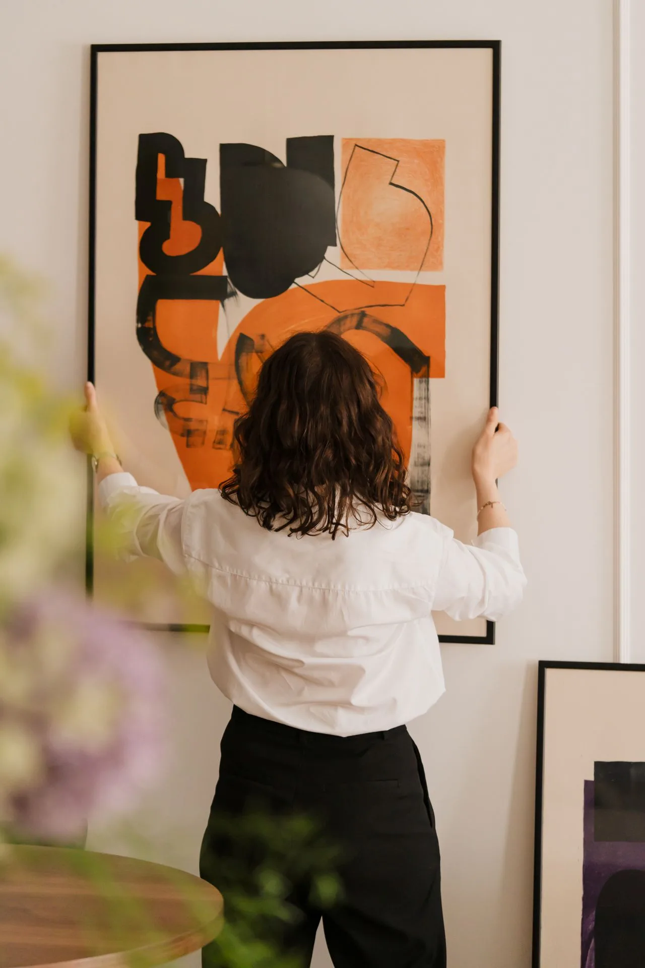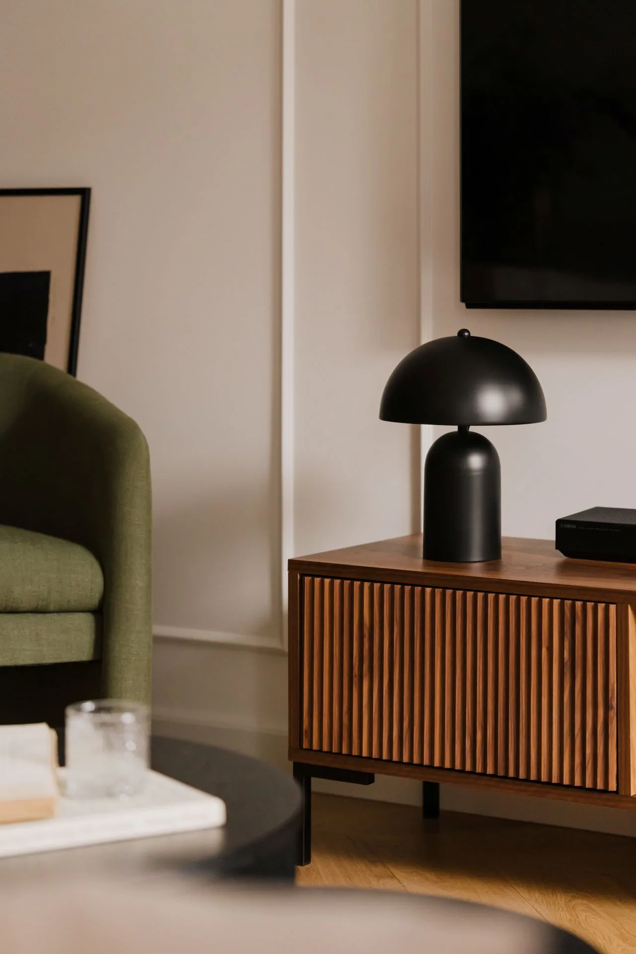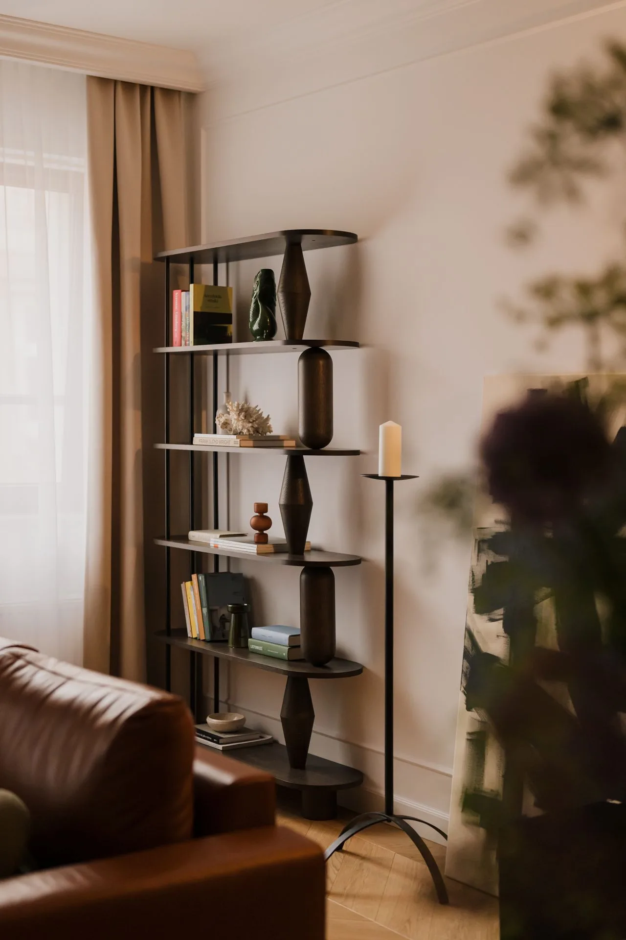 W salonie króluje skórzana sofa, obok której stoi rzeźbiarski regał – nie tylko praktyczny, lecz również wystawienniczy. To tu znalazły swoje miejsce rzeźby Pauli Pietruszki, litografie Anny Khachatryan oraz obraz „Brda” Andrzeja Fogtta. Nad stolikami kawowymi zawisła lekka lampa, wprowadzająca miękkie światło sprzyjające rozmowom i spotkaniom. Wszystko zamknięte w ramach mebli projektowanych na wymiar – tak, aby każdy centymetr przestrzeni służył wygodzie i estetyce.
