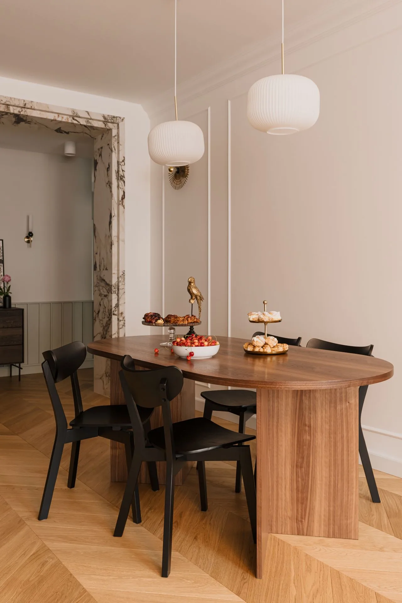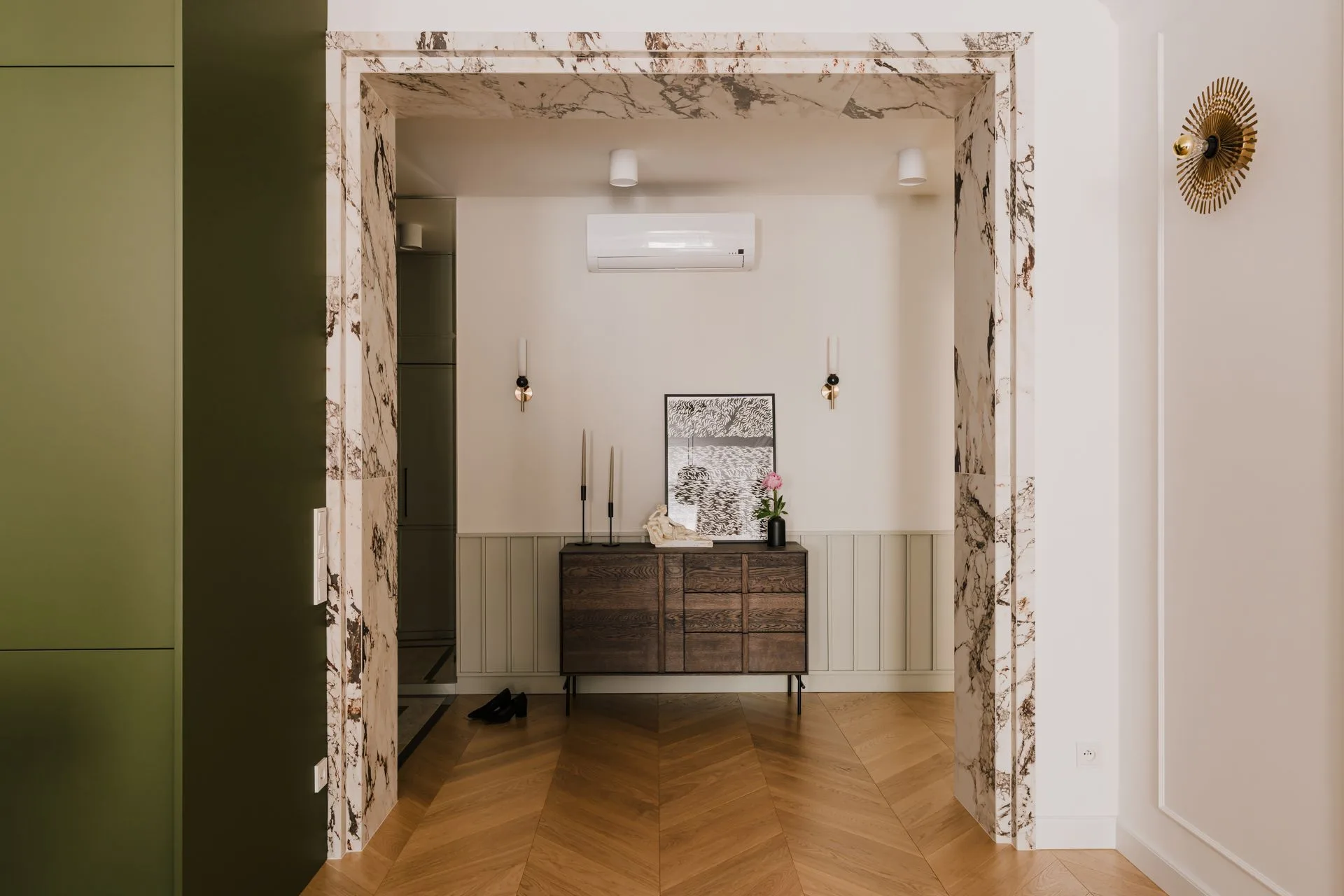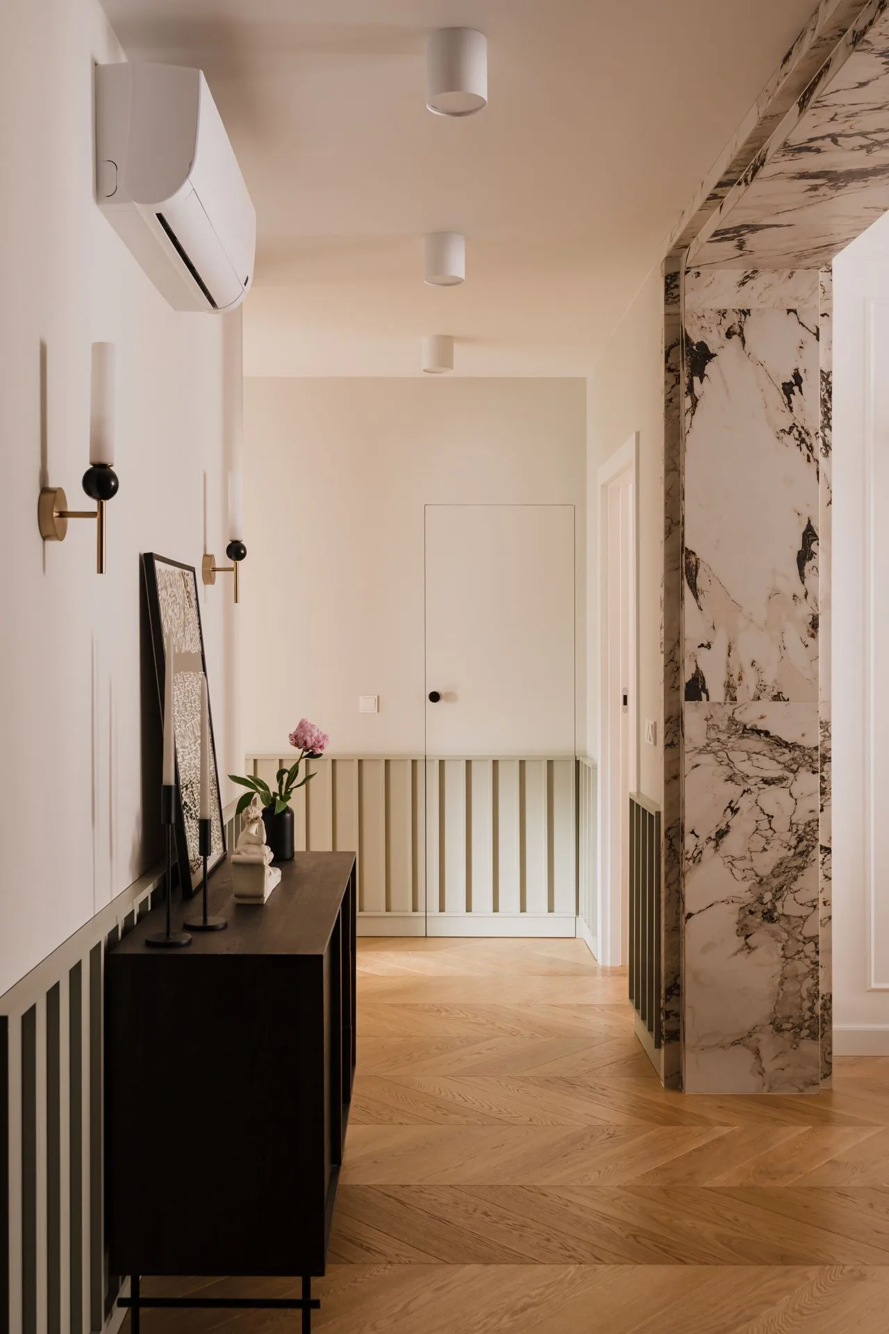 Sztukaterie, lamperie, granitowe posadzki – wszystko dobrane z chirurgiczną precyzją. Kamień, zimny i dostojny, kontrastuje z naturalnym ciepłem drewna, tworząc balans pomiędzy tradycją a nowoczesnością. To mieszkanie nie tylko opowiada historię miejsca, ale samo staje się jej częścią.