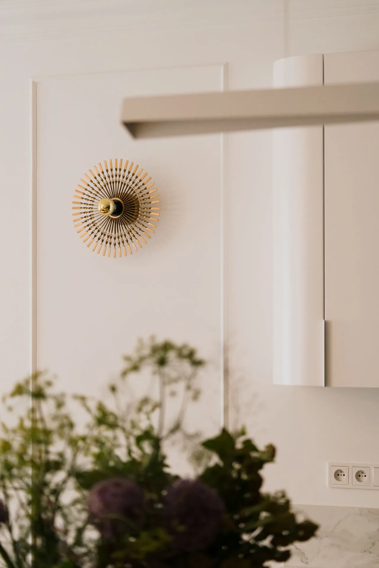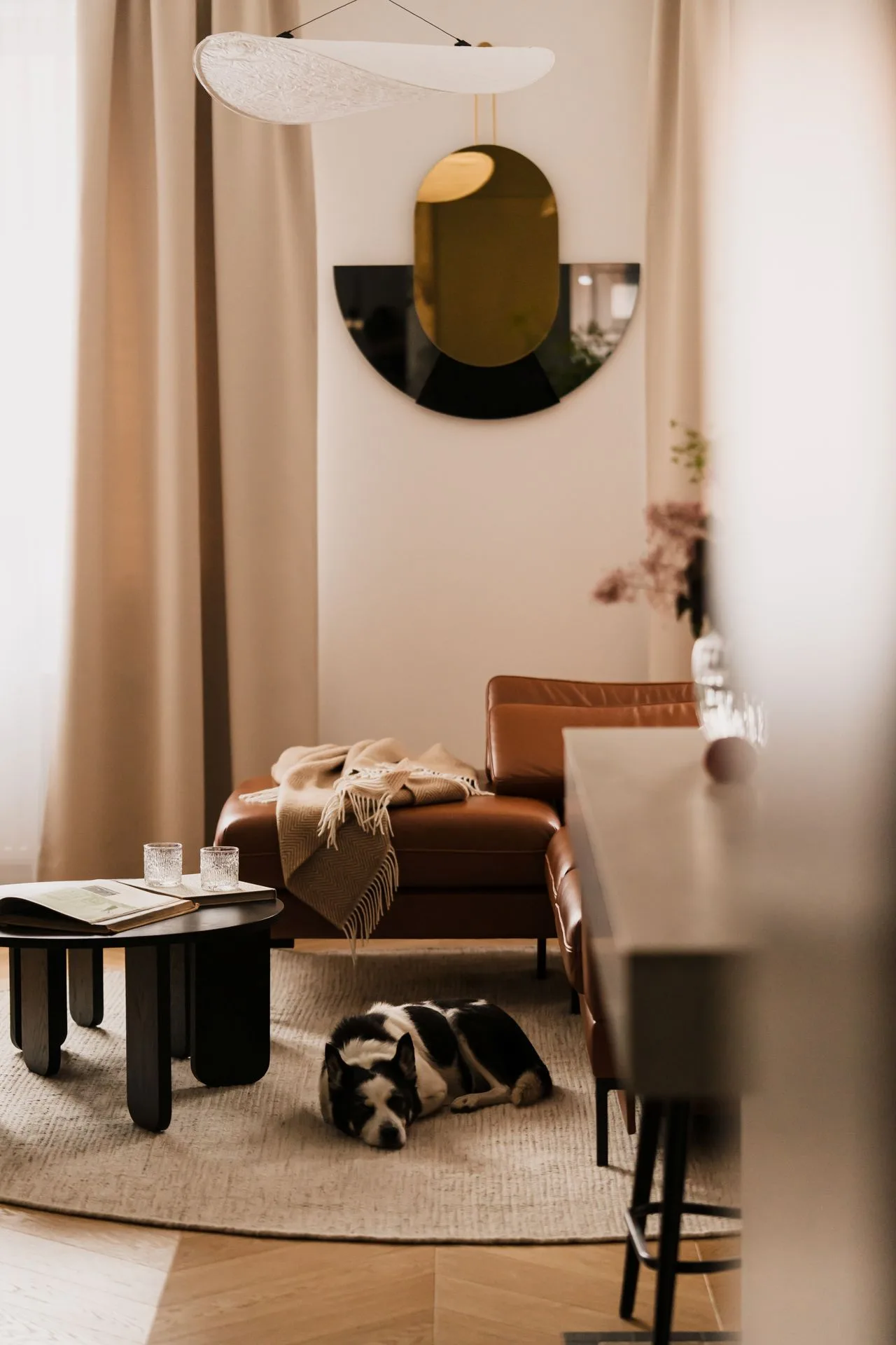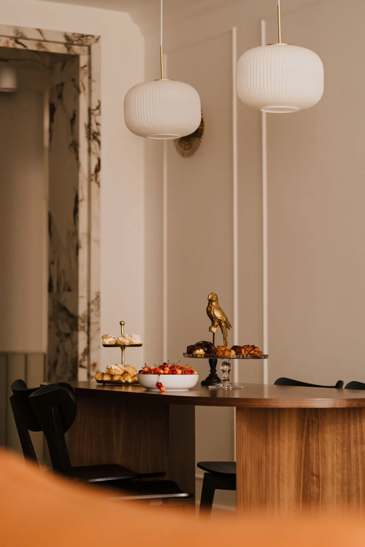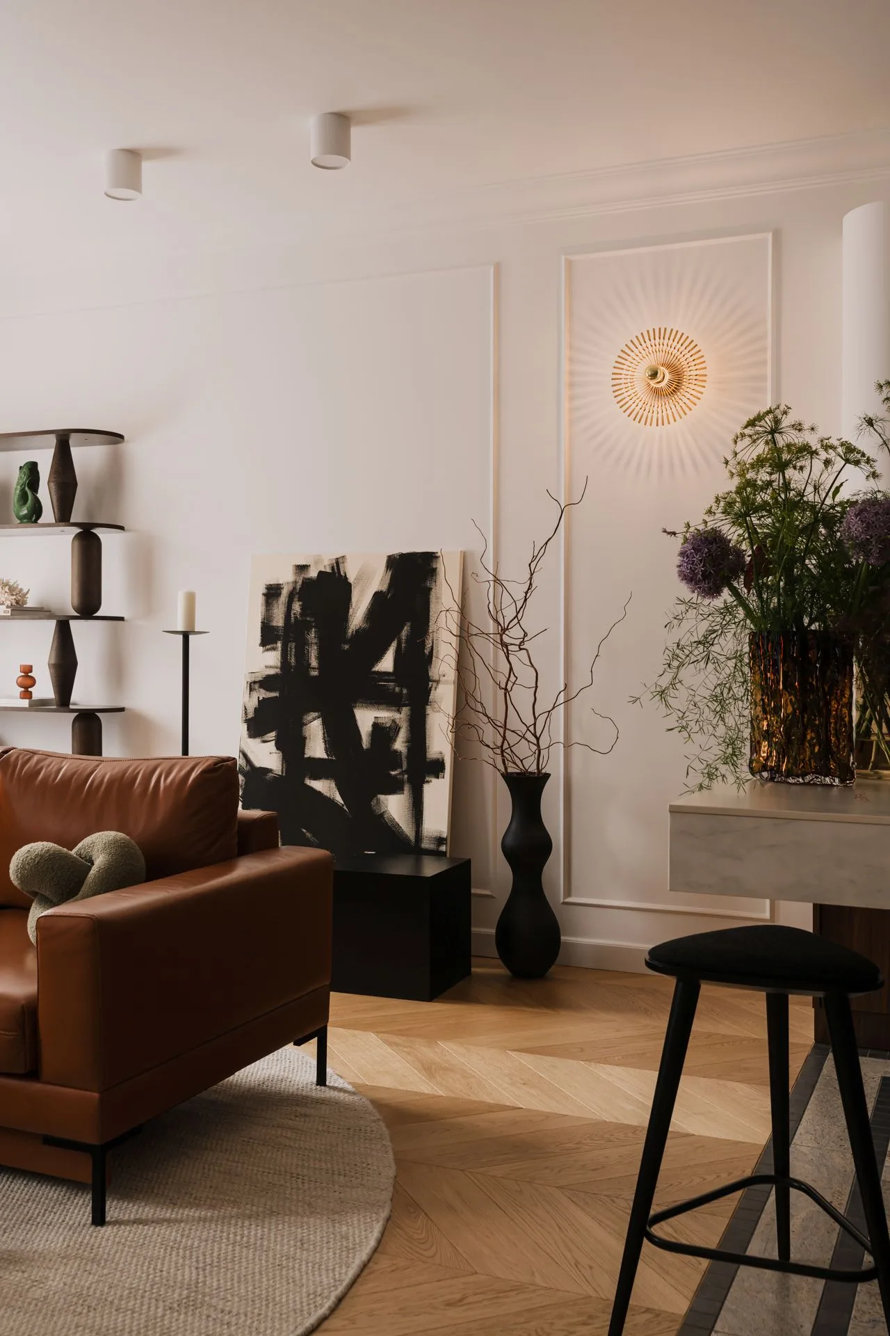 Sztukaterie, lamperie, granitowe posadzki – wszystko dobrane z chirurgiczną precyzją. Kamień, zimny i dostojny, kontrastuje z naturalnym ciepłem drewna, tworząc balans pomiędzy tradycją a nowoczesnością. To mieszkanie nie tylko opowiada historię miejsca, ale samo staje się jej częścią.