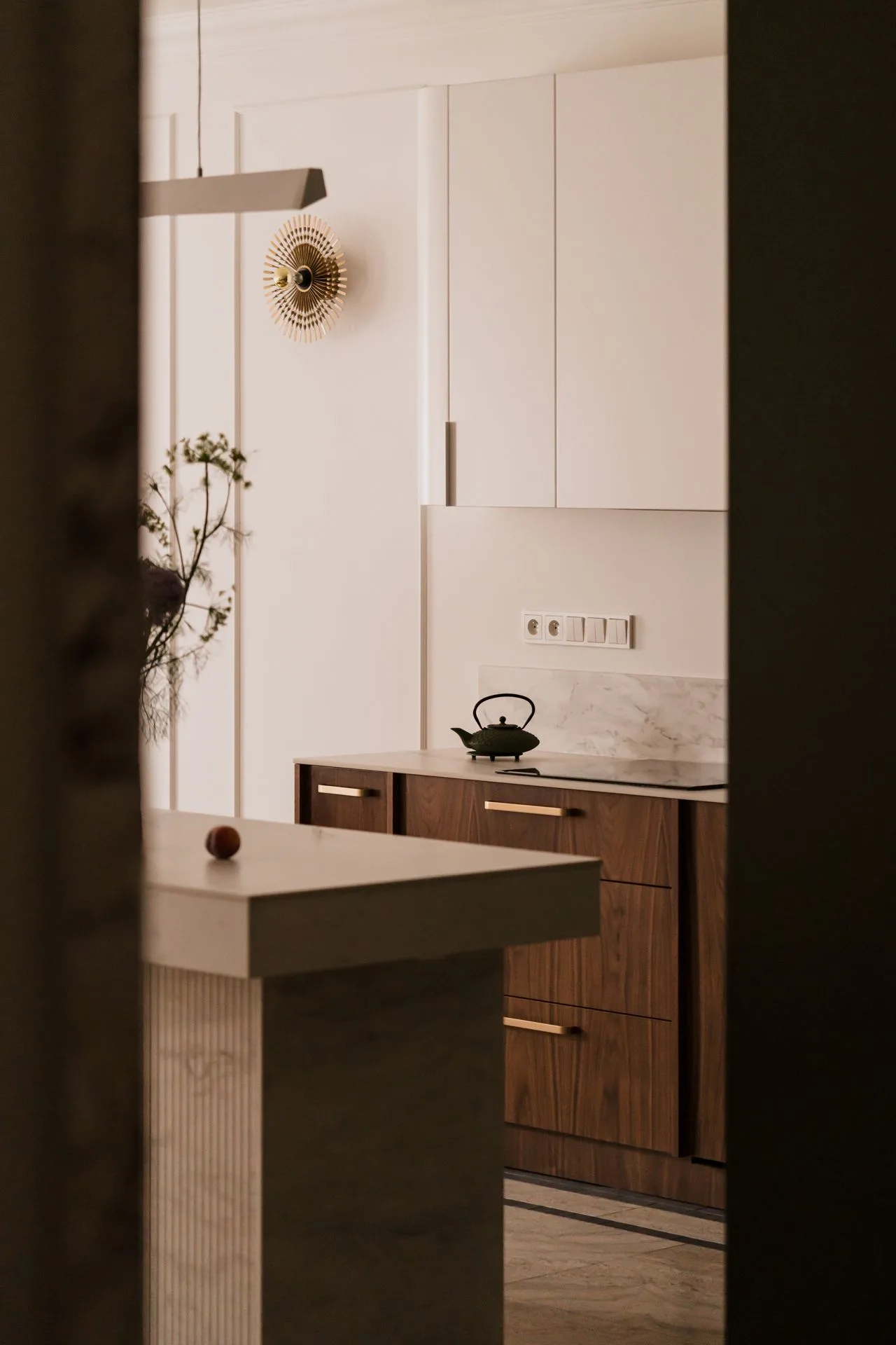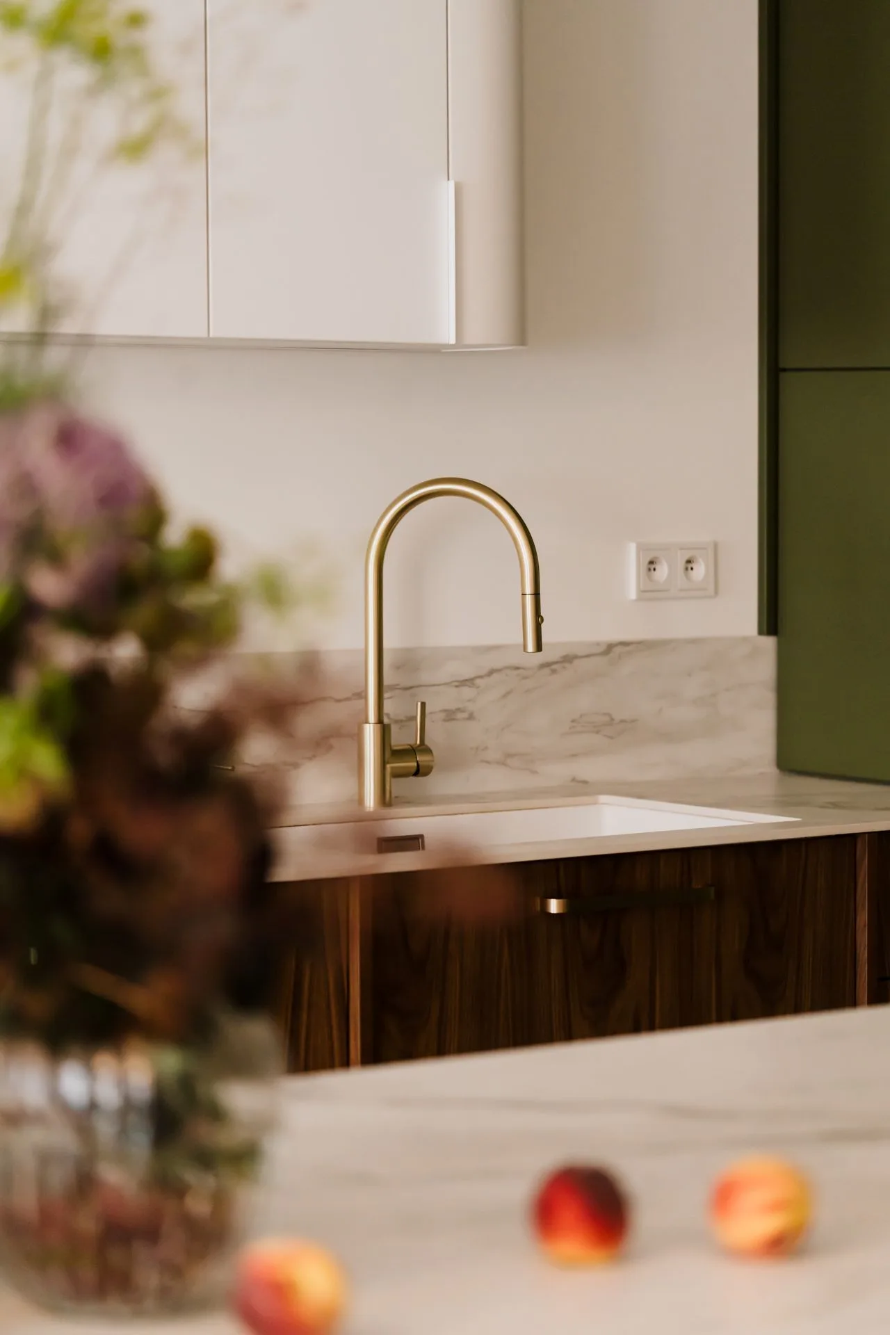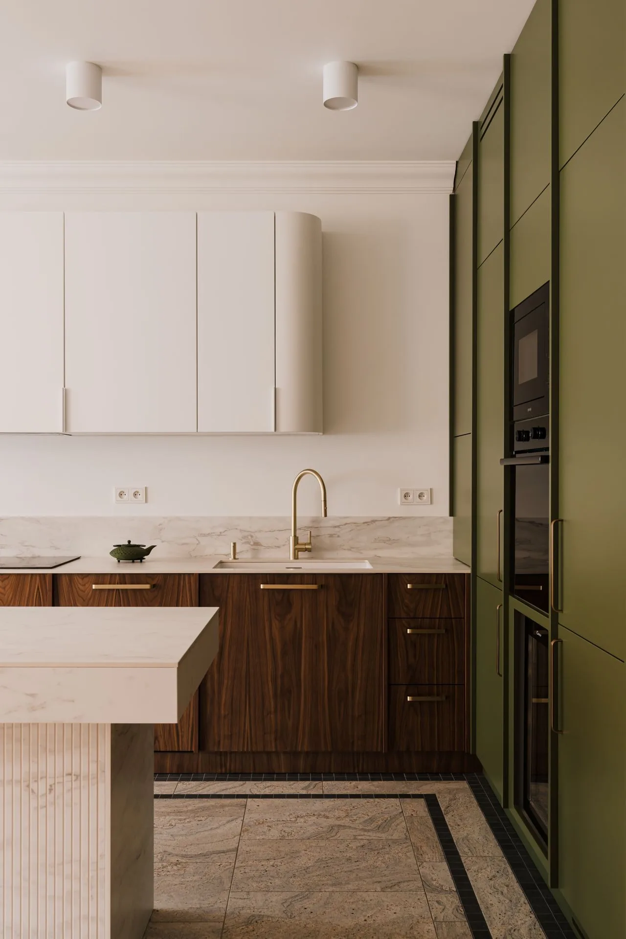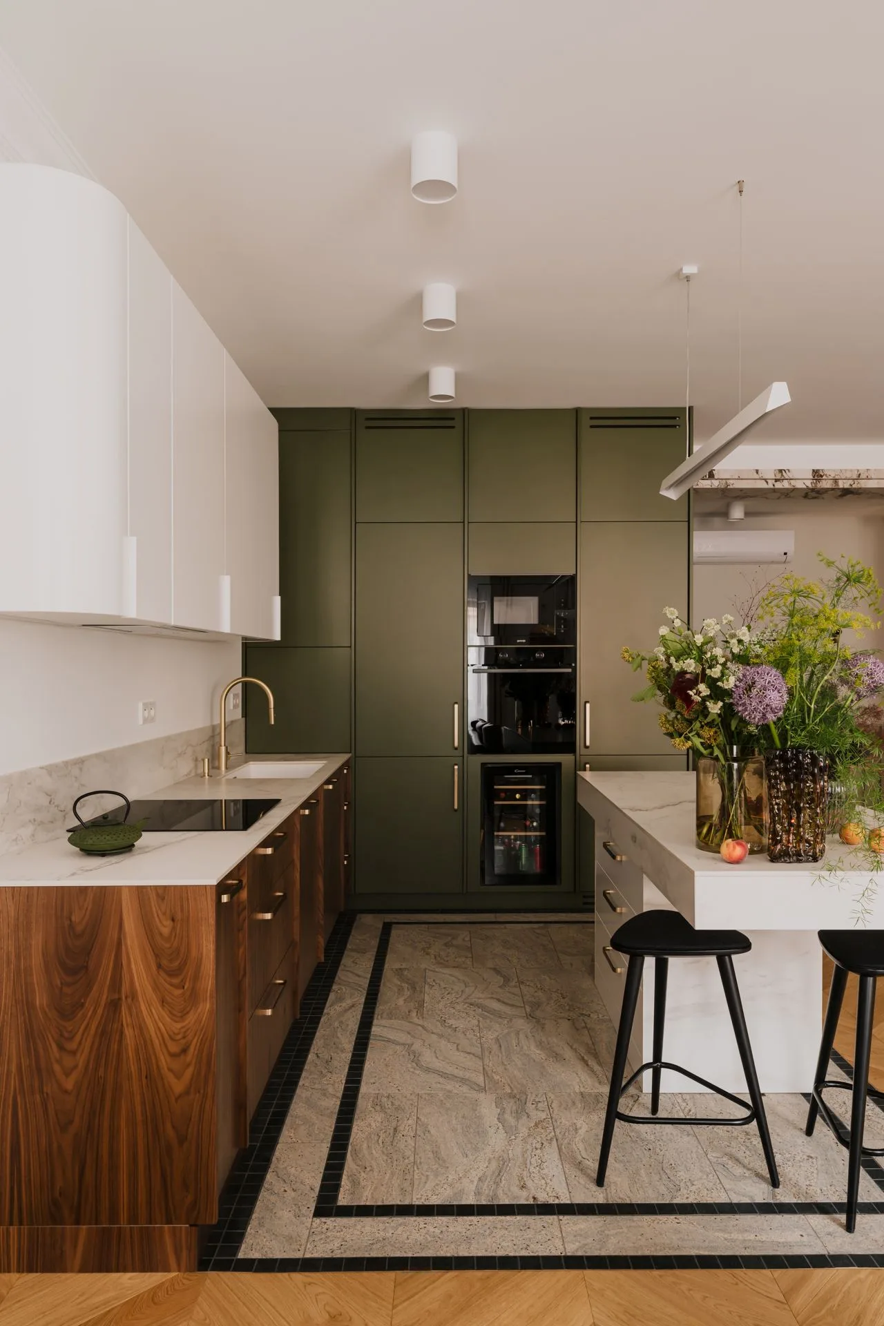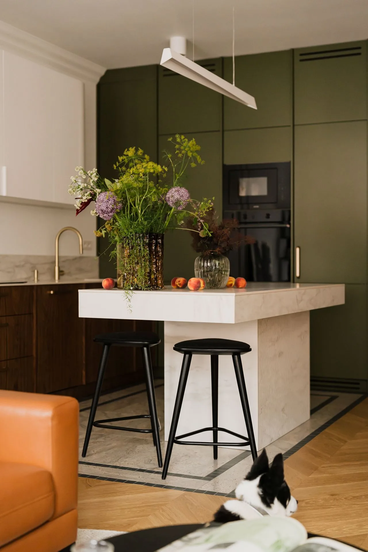 Wejście do strefy dziennej zdobi kamienny portal – niczym brama między historią a współczesnością. W kuchni króluje zabudowa w odcieniu zgaszonej zieleni, która wprowadza spokój i wyrafinowanie. Centrum stanowi biała, kamienna wyspa o rzeźbiarskiej formie, z frezowaną nogą niczym kolumna wspierająca harmonię całej kompozycji. Fornir o głębokim, ciemnym tonie i obła szafka wisząca równoważą geometrię zabudowy, łagodząc linie, a jednocześnie nadając charakter. To wnętrze, w którym nowoczesna funkcjonalność tańczy w duecie z ponadczasową elegancją.